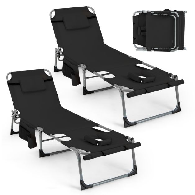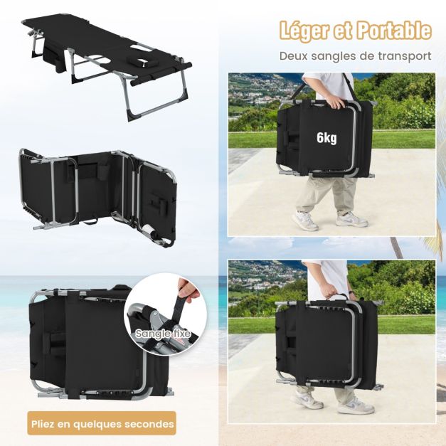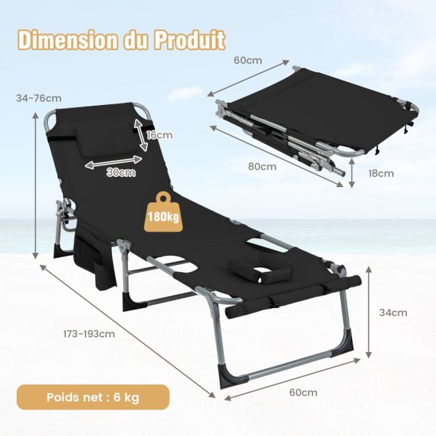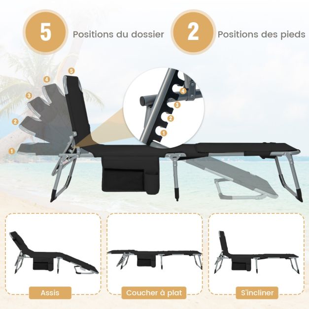 Chaise longue pliante à 5 positions repose-pieds réglables trou pour le visage oreiller amovible poche de rangement chaise pliable et légère noir 20_0008180