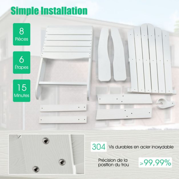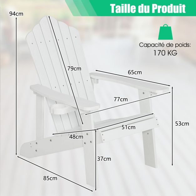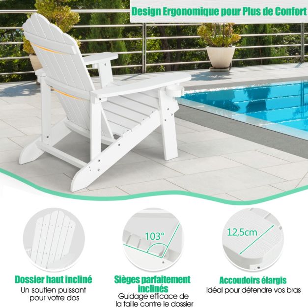 Fauteuil de jardin adirondack en hips bois massif imperméable avec porte-gobelet charge 170 kg pour piscine terrasse blanc 20_0005236