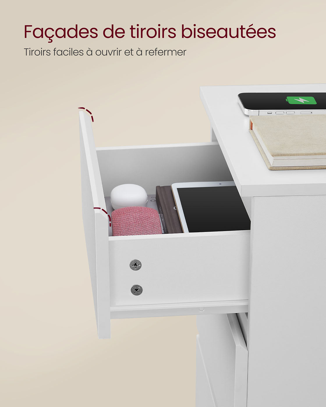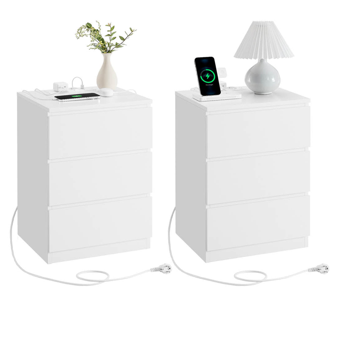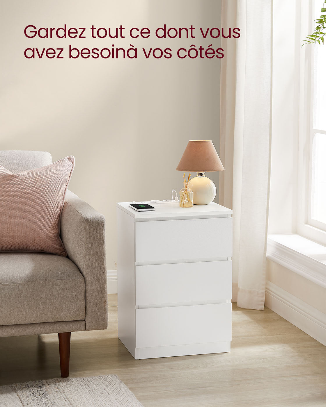 Table de chevet avec multiprise table d’appoint avec 3 tiroirs 2 prises ca 2 ports usb façades de tiroirs biseautées pour salon chambre bureau moderne blanc 12_0007612