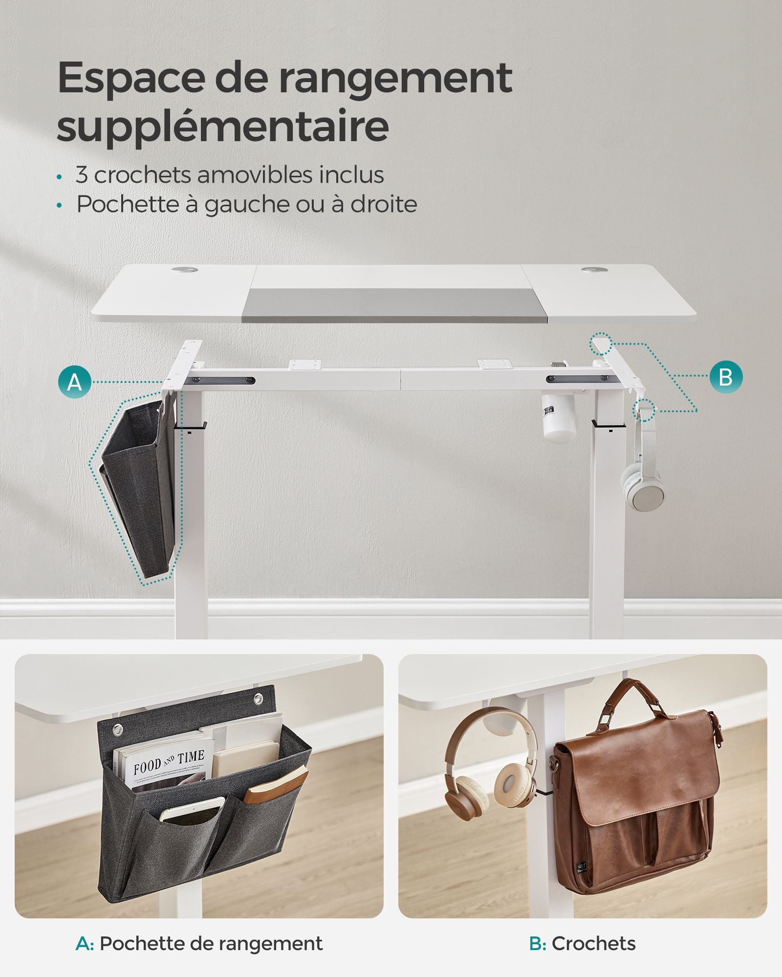 Pour garder votre bureau bien ordonné, une pochette latérale peut être placée à droite ou à gauche afin d’y ranger vos livres, documents ou accessoires. Trois crochets sont également fournis pour suspendre vos sacs ou casques, tandis que deux passe-câbles discrets permettent de gérer facilement les fils d’alimentation, offrant ainsi un plan de travail dégagé et agréable.