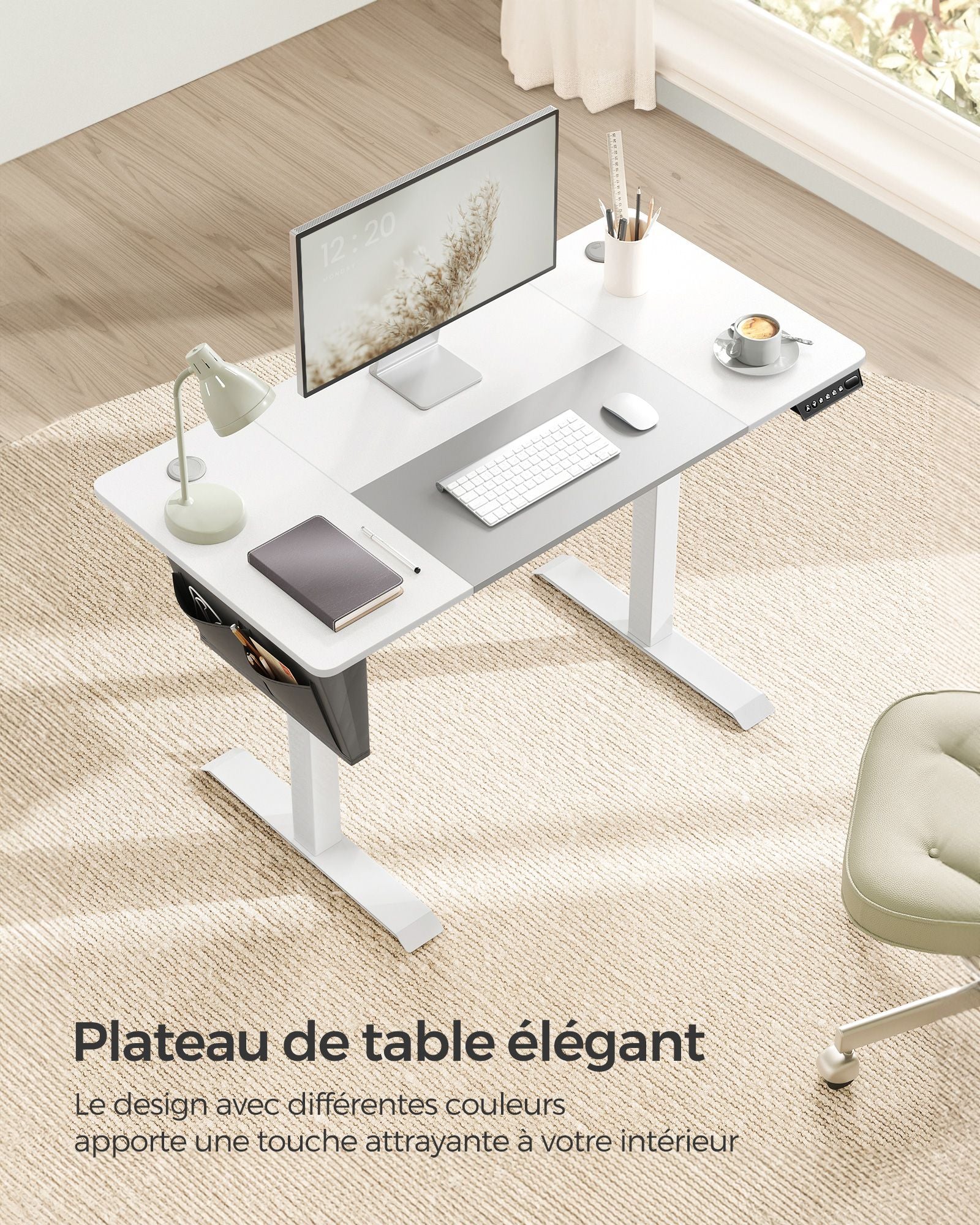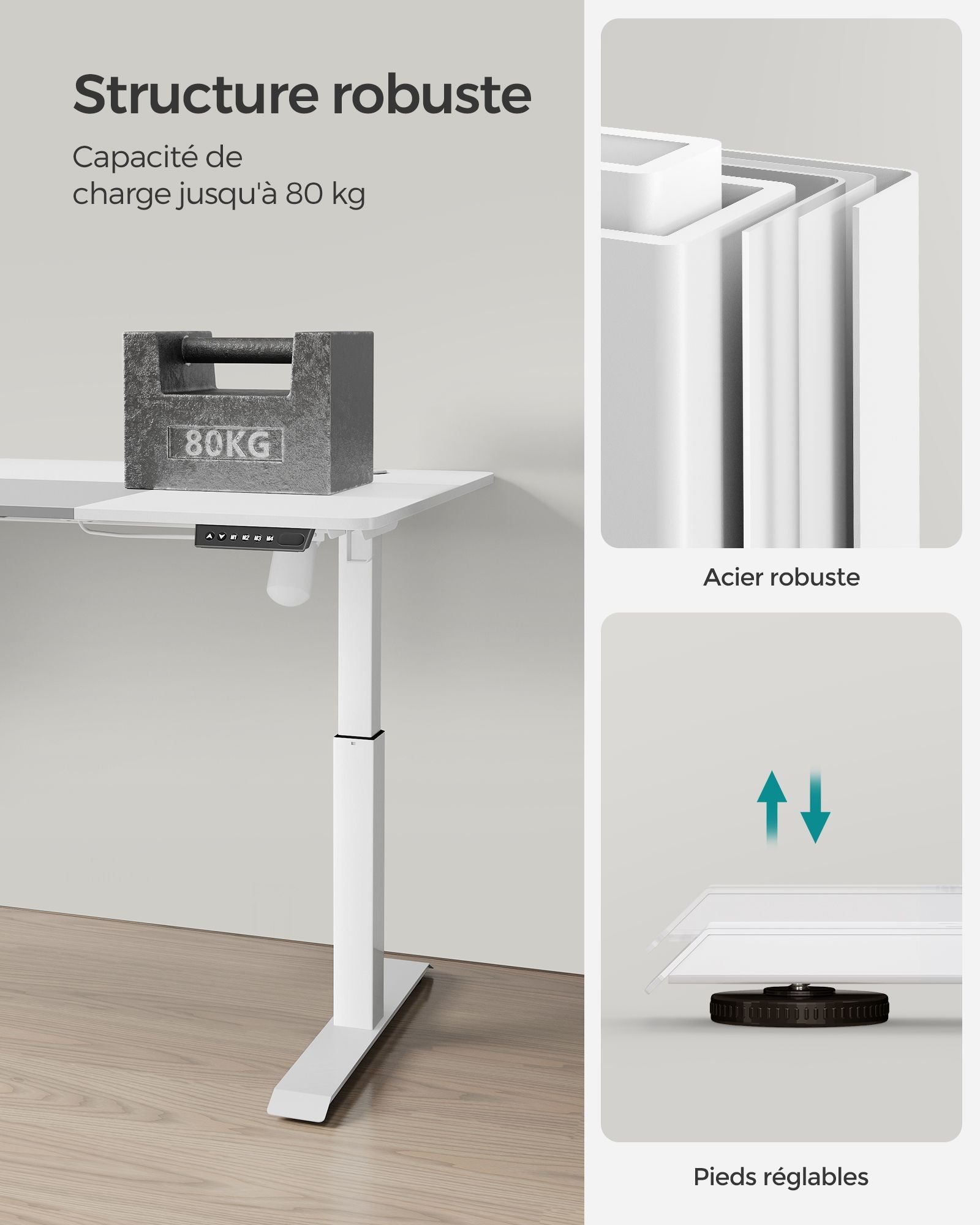 Conçu avec un cadre en acier robuste, ce bureau offre une excellente stabilité et peut supporter jusqu’à 80 kg. Son moteur silencieux, dont le niveau sonore reste inférieur à 50 dB, garantit un ajustement fluide et discret, idéal pour un environnement calme.