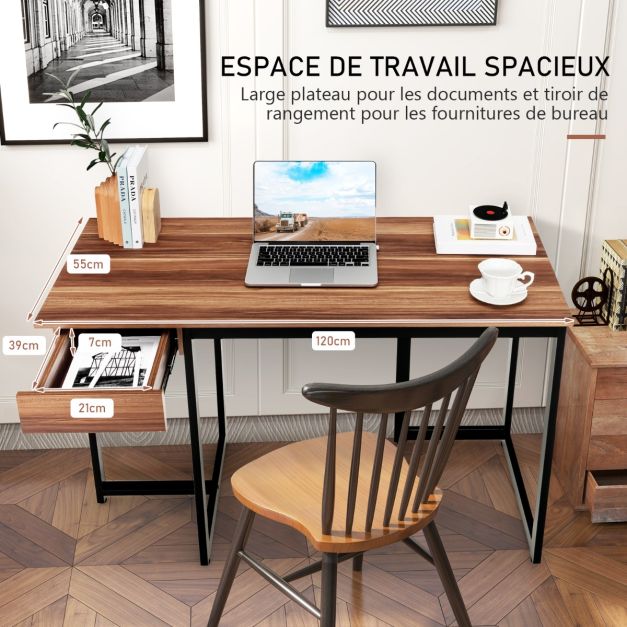Bureau d'ordinateur 120cm tiroir cadre en métal repose-pieds réglables bureau moderne station de travail pour ordinateur portable noyer 20_0004830