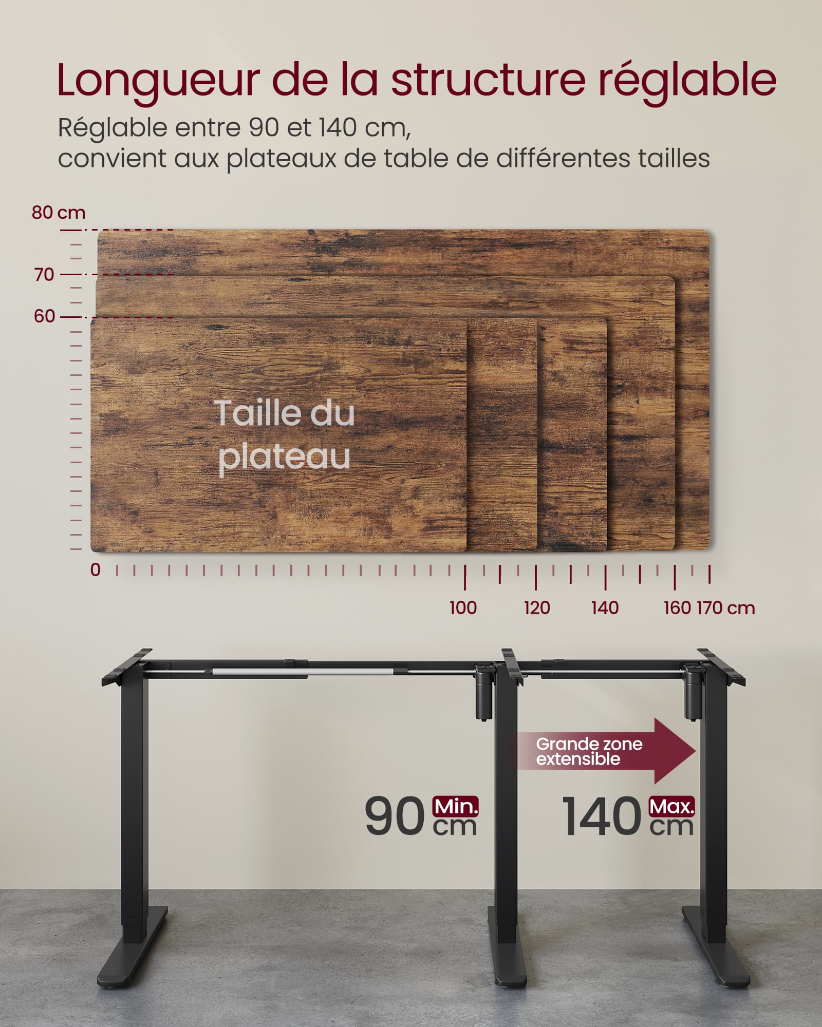 Ce cadre de bureau noir est réglable en longueur de 90 à 140 cm, il convient aux plateaux de table de 100 à 170 cm de longueur et de 50 à 80 cm de largeur. Idéal pour le bureau ou le salon.