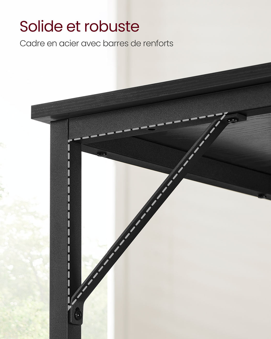 Conçu à partir de panneaux d’aggloméré de qualité et d’un cadre en acier renforcé par des barres transversales, ce bureau est à la fois robuste et durable. Il peut supporter jusqu’à 50 kg, garantissant une surface de travail stable et fiable au quotidien.