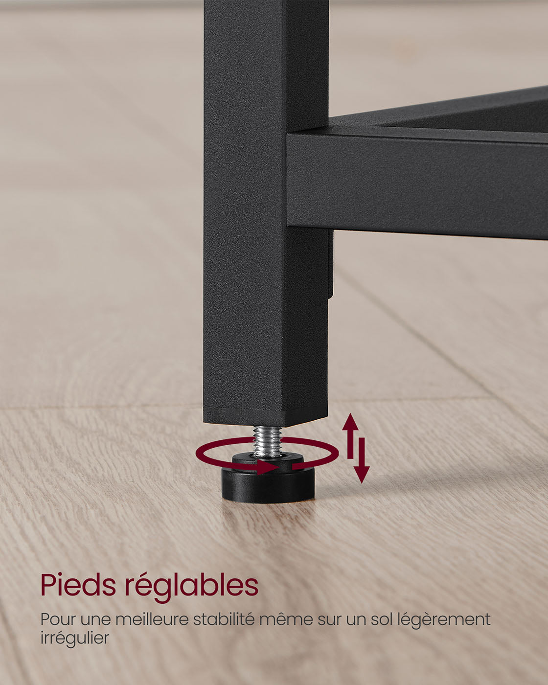 Les pieds réglables assurent une excellente stabilité, même sur des sols légèrement irréguliers, pour un espace de travail confortable et sans vacillement.
