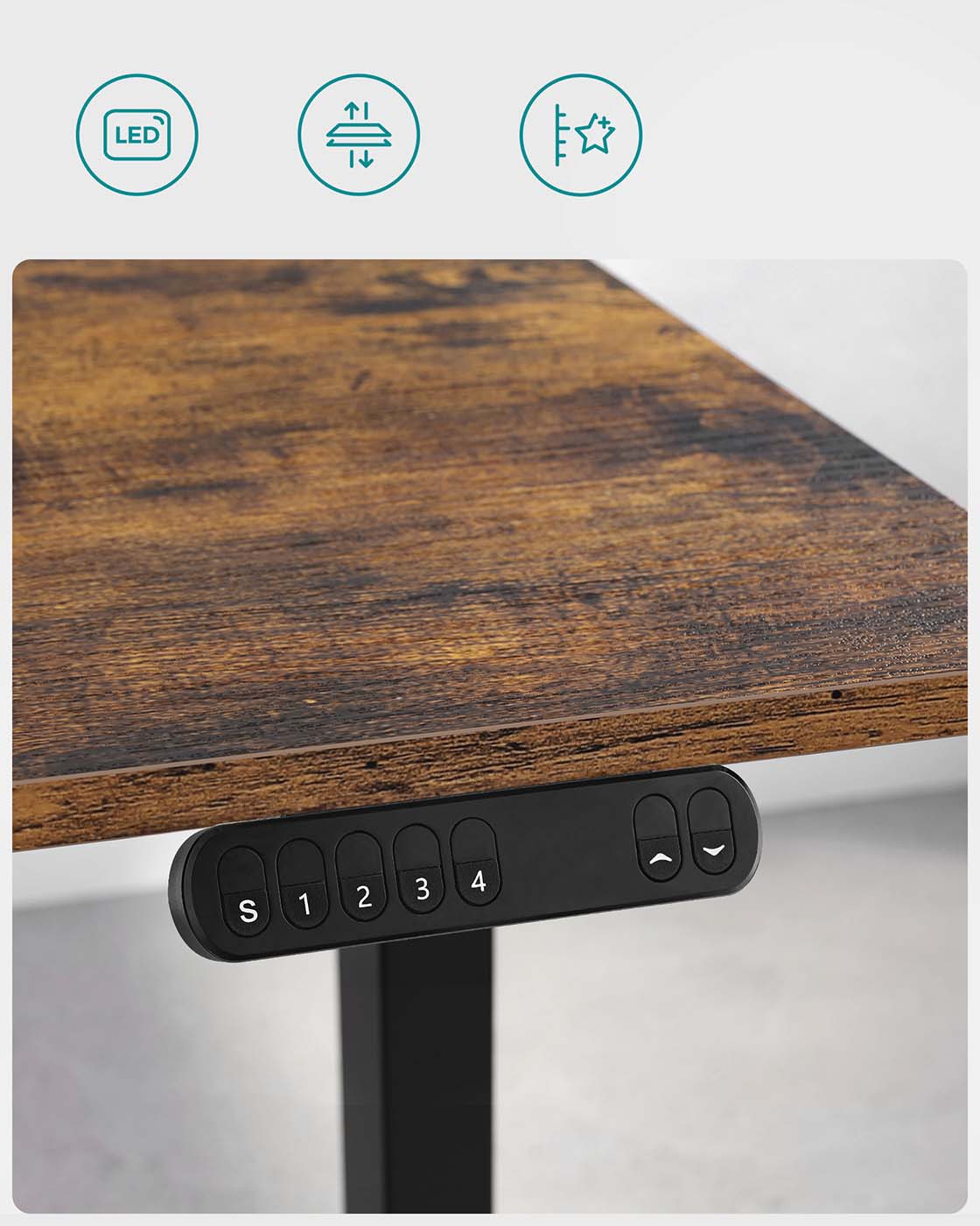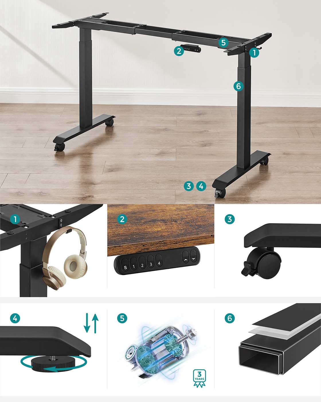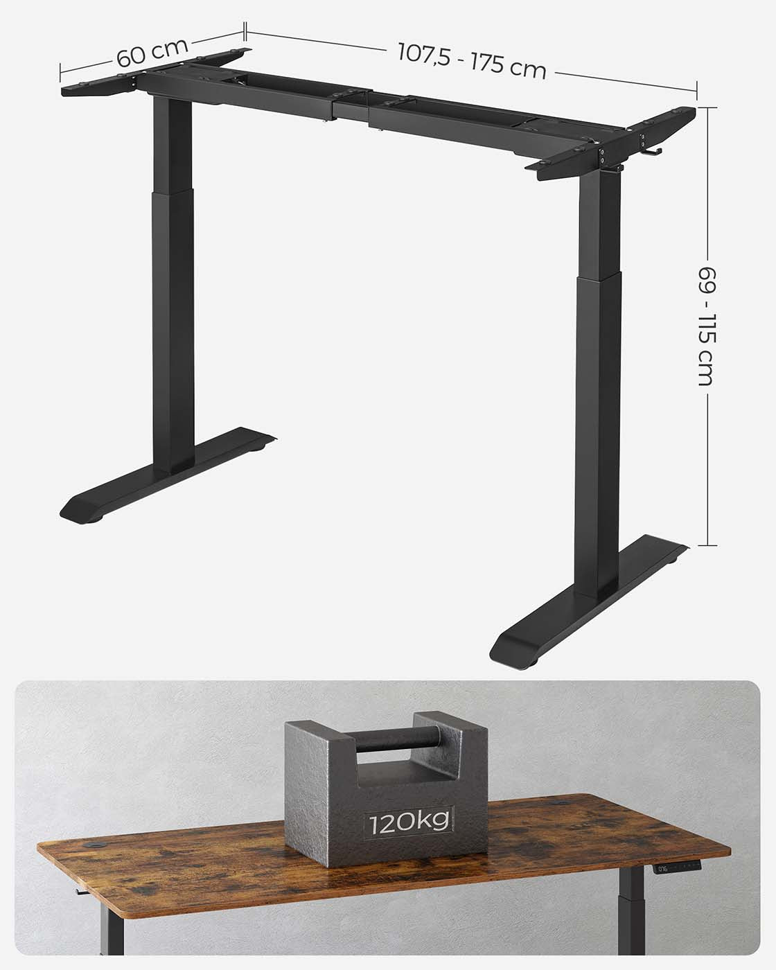 Ce cadre de bureau électrique est conçu pour améliorer votre confort de travail en vous permettant d’alterner entre position assise et debout. Réglable en hauteur de 69 à 115 cm, il convient aux utilisateurs mesurant entre 1,10 m et 1,95 m, afin de trouver facilement la posture idéale pour travailler plus sainement.