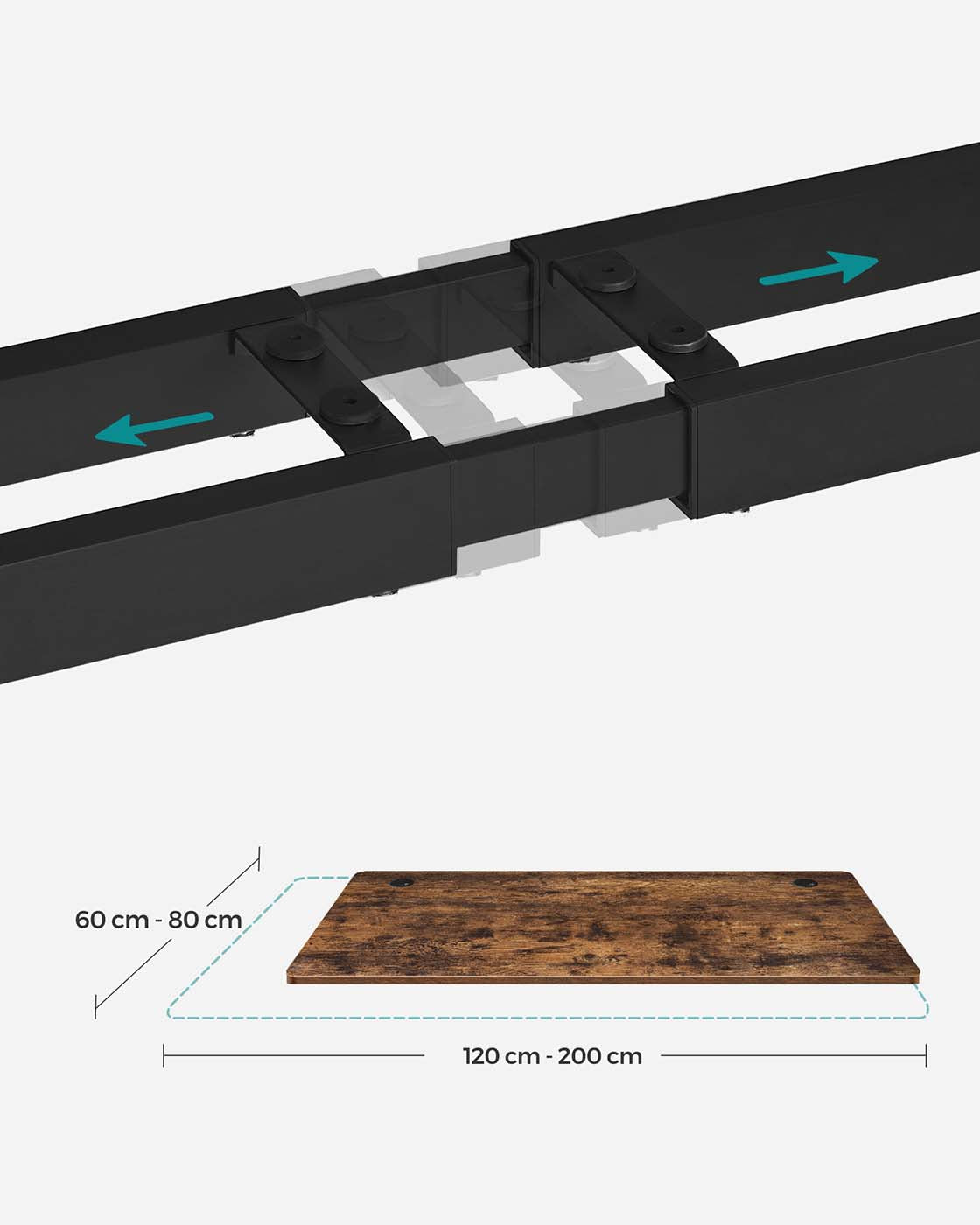 Adaptable, la longueur du cadre est réglable entre 107,5 et 175 cm, ce qui le rend compatible avec des plateaux de bureau de 120 à 200 cm de long et de 60 à 80 cm de large.