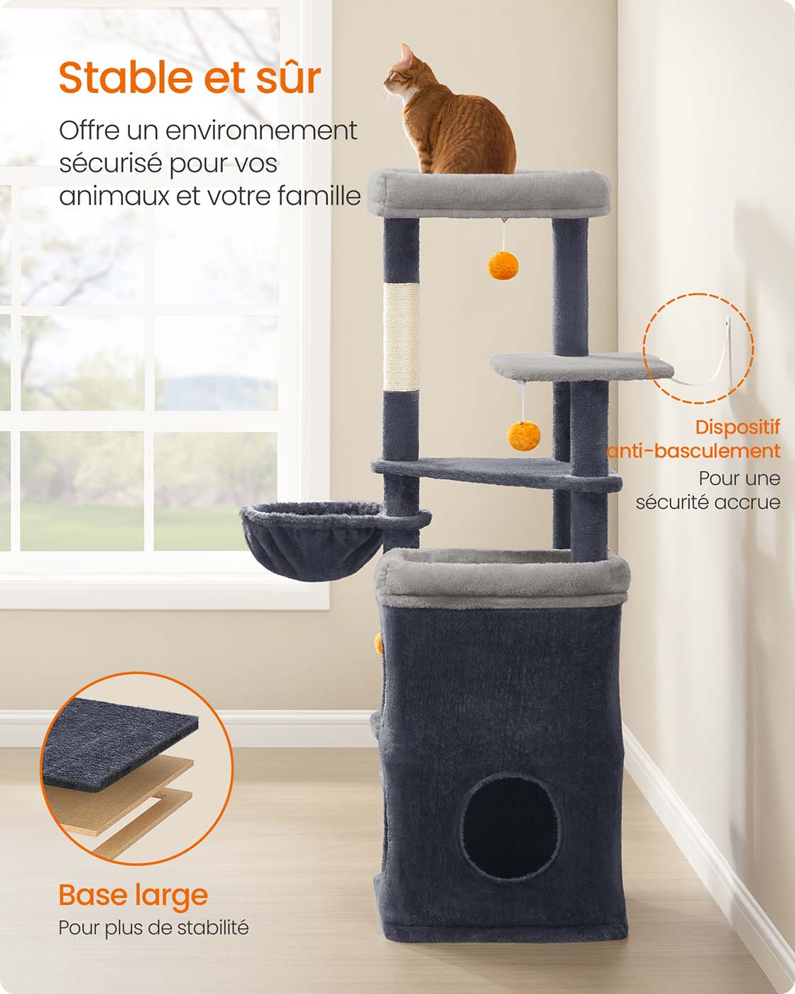 Stable et sécurisé, cet arbre à chat est conçu à partir de panneaux d’aggloméré robustes. Le dispositif anti-basculement inclus renforce la sécurité, garantissant une expérience de jeu sans risque, même pour les chats les plus dynamiques.