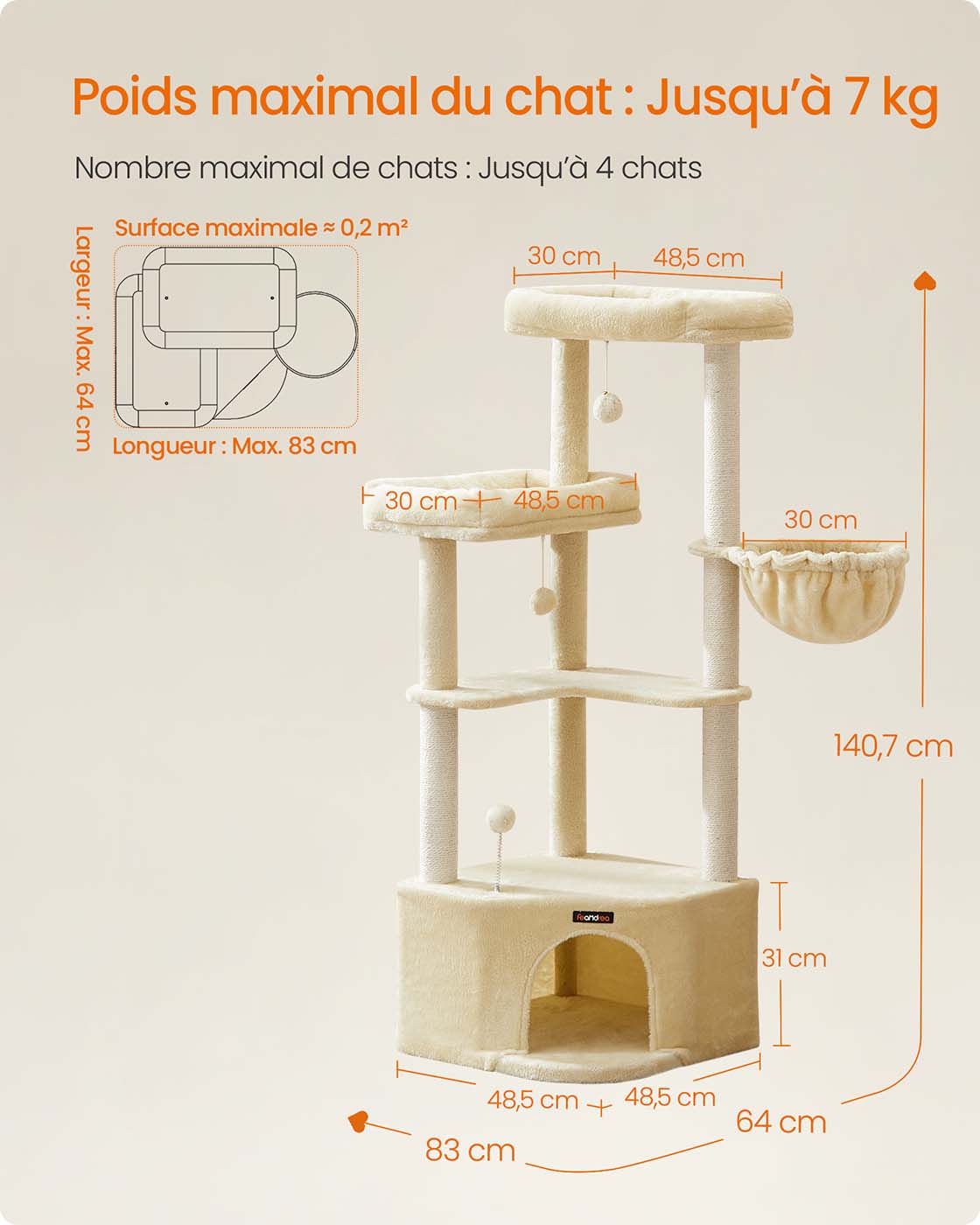 Cet arbre à chat spacieux offre à vos compagnons félins un véritable espace de détente et de jeu. Avec ses deux plateformes de 48,5 x 30 cm, sa niche confortable de 48,5 x 48,5 cm et son hamac de 30 cm de diamètre, il convient aussi bien aux grands chats qu’aux foyers comptant plusieurs animaux.