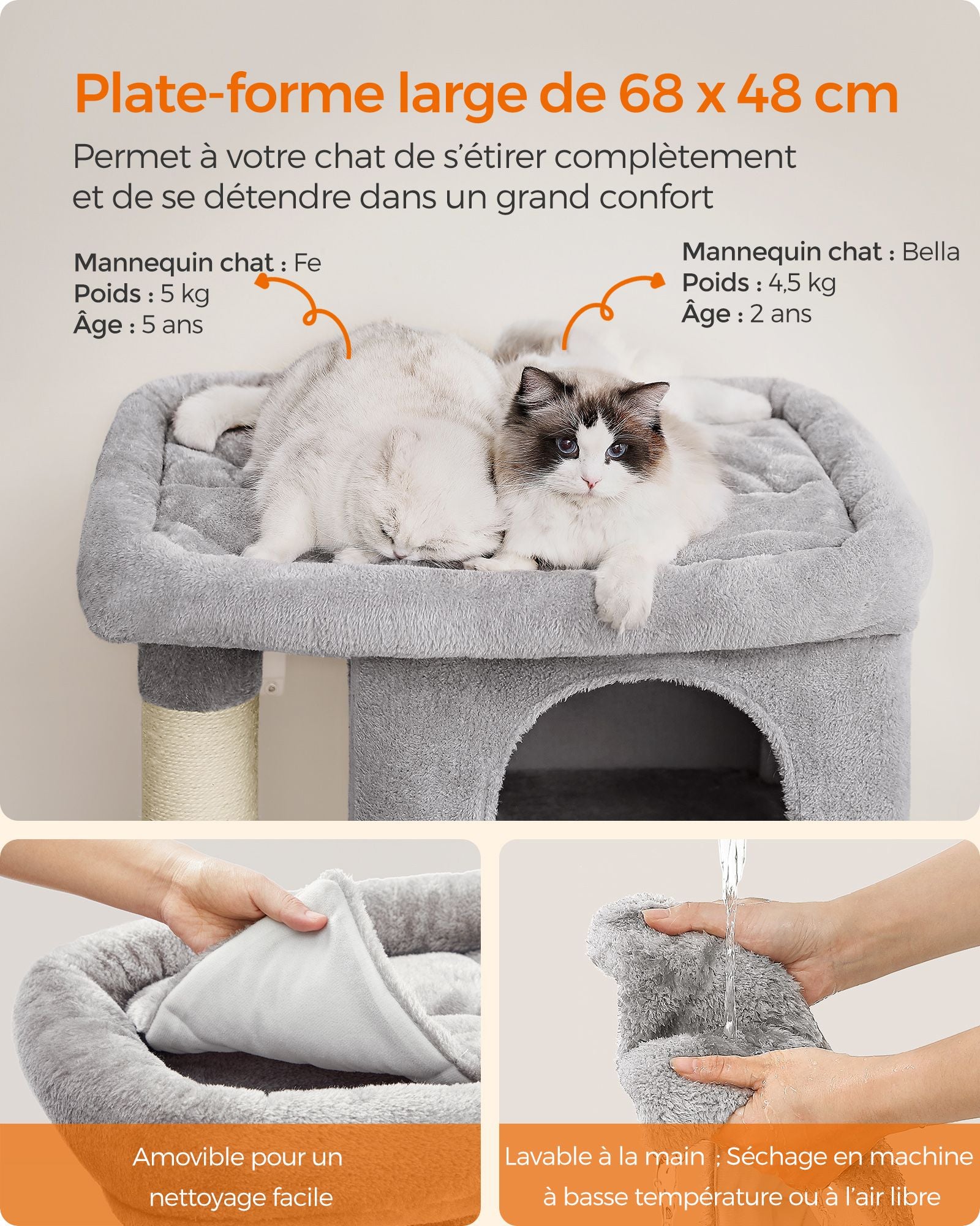 Cet arbre à chat spacieux est conçu pour offrir confort et divertissement, même aux plus grands félins. Sa large plate-forme de 68 x 48 cm, dotée de bords rehaussés et rembourrés, constitue un espace idéal pour que votre chat s’étire, se repose ou partage un moment avec d’autres compagnons. Il convient parfaitement aux grands chats comme les Maine Coons ou à plusieurs chats adultes.