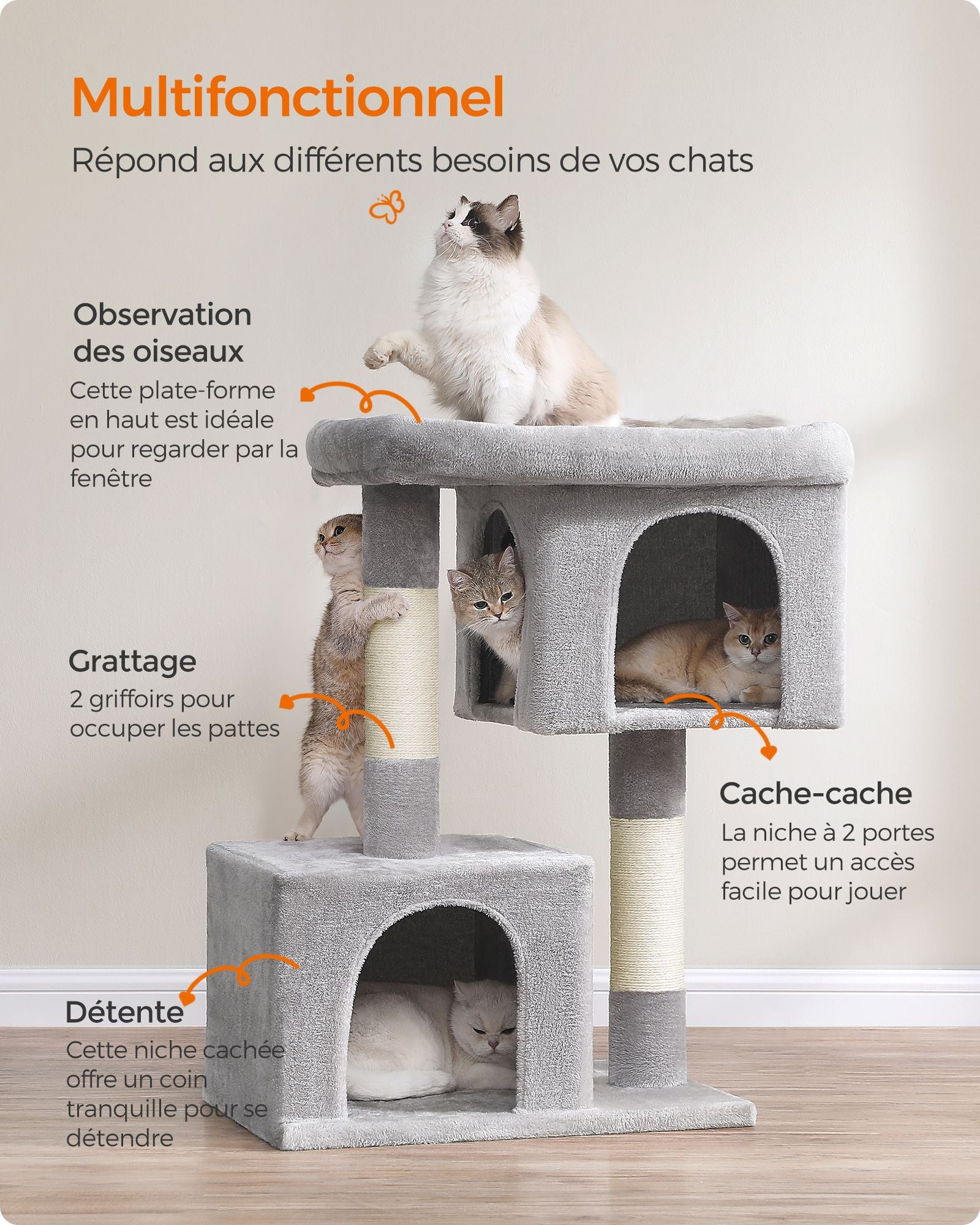 Il dispose de deux niches confortables : celle du haut, équipée de deux portes, offre une vue dégagée et un accès facile, tandis que celle du bas, plus calme et accessible, est idéale pour les chats âgés qui préfèrent rester près du sol.