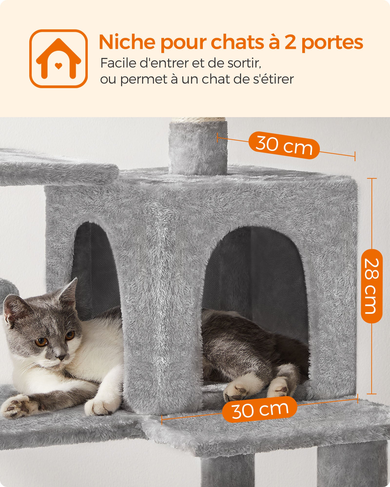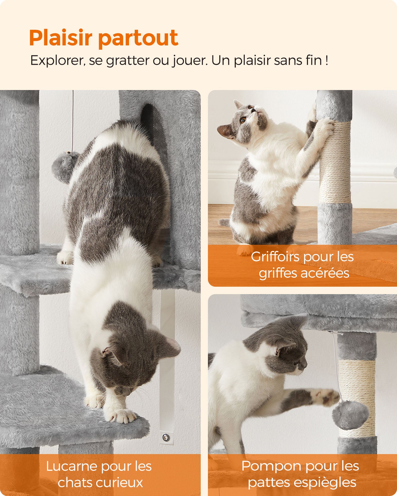 Stable et sécurisé, il repose sur une base renforcée et est livré avec un dispositif anti-basculement. Ainsi, votre chat peut sauter, grimper et se dépenser en toute sécurité. L’arbre peut accueillir jusqu’à 3 chats de 5 kg chacun, parfait pour les foyers avec plusieurs félins.