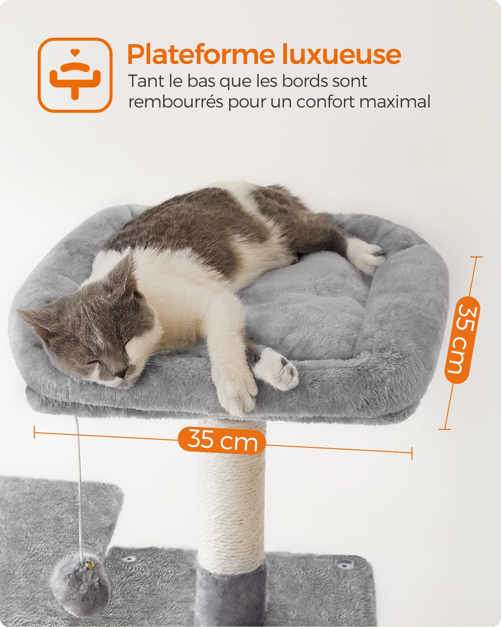 Côté détente, un hamac moelleux situé en bas invite aux longues siestes, tandis qu’une plateforme rembourrée en hauteur permet d’observer confortablement les alentours. Pour le jeu, un pompon suspendu complète l’ensemble et stimule l’instinct joueur de votre compagnon.