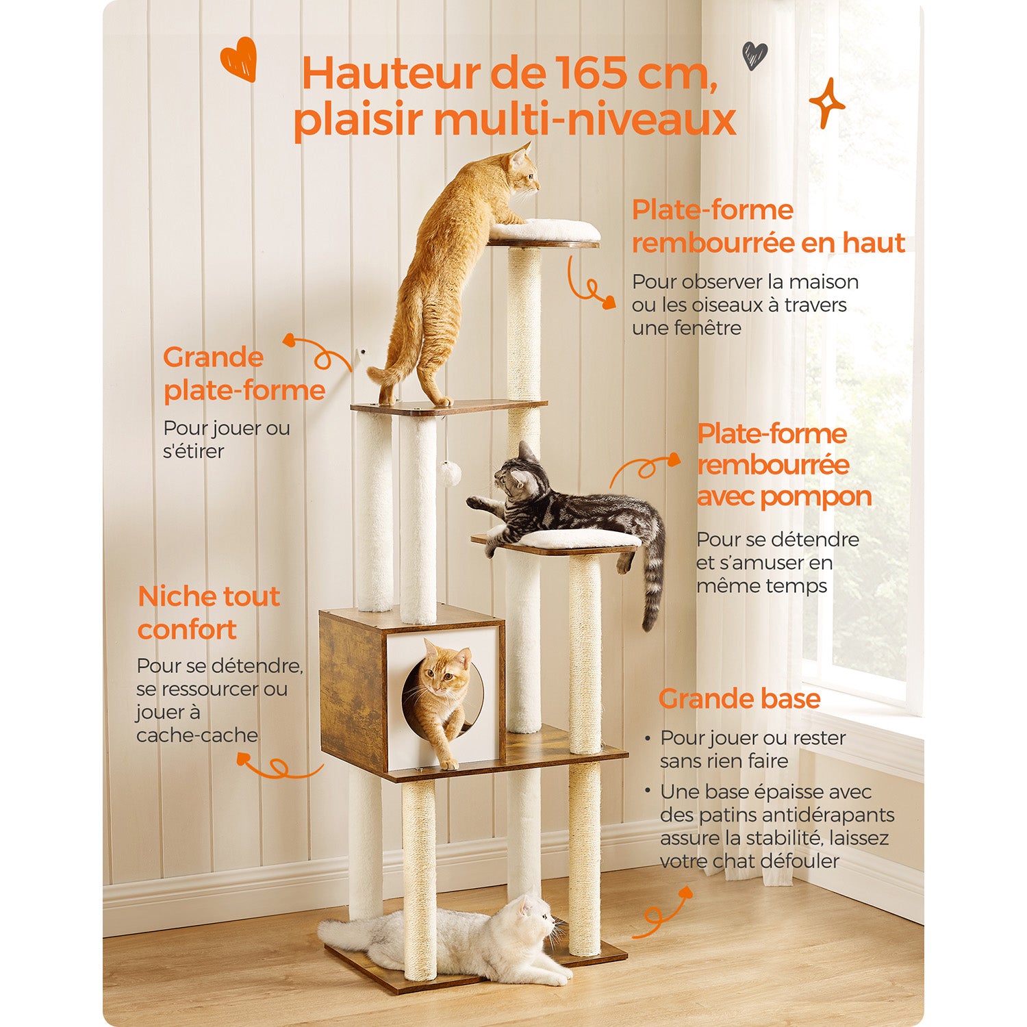 Haut de 165 cm, il exploite pleinement l’espace vertical pour le plus grand bonheur des foyers comptant plusieurs chats. Entre les différentes plateformes, la niche douillette et le perchoir supérieur, vos chats pourront grimper, jouer, observer leur environnement ou simplement se reposer confortablement.