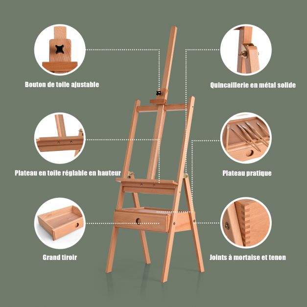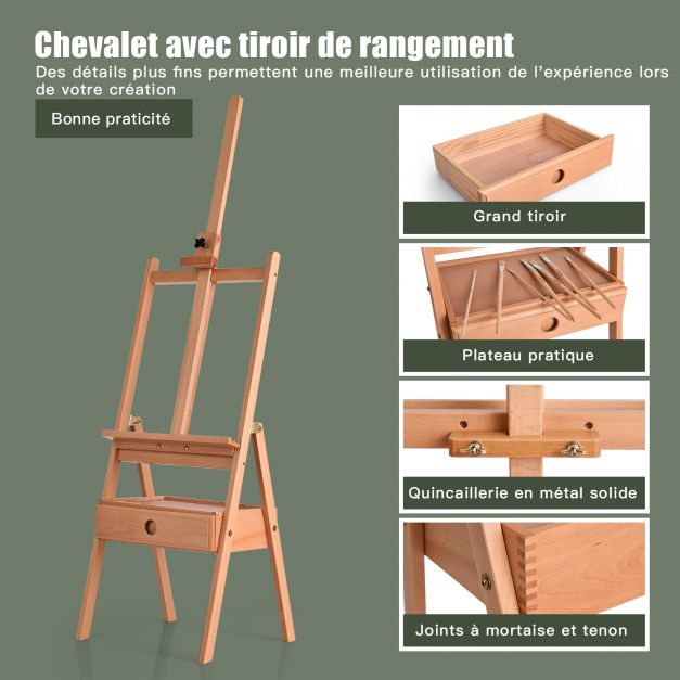 Chevalet de studio sur pied avec tiroir fait en hêtre porte-toile réglable supporte une toile jusqu'à 92 cm 43 x 44 x 151-194,5 cm 20_0008264