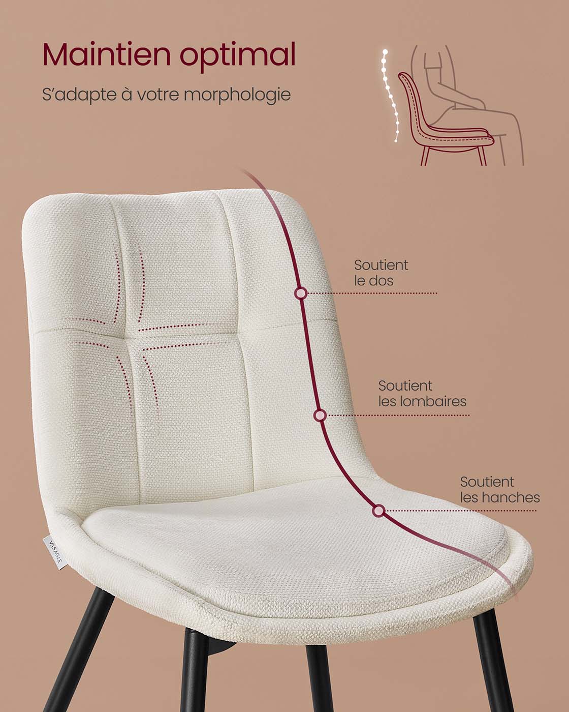 Leur design ergonomique épouse les formes naturelles du corps, ce qui améliore la posture et réduit la fatigue. Revêtues d’un tissu chenille à la fois élégant et résistant à l’usure, elles ajoutent une touche raffinée à votre salle à manger tout en garantissant une longue durée de vie.