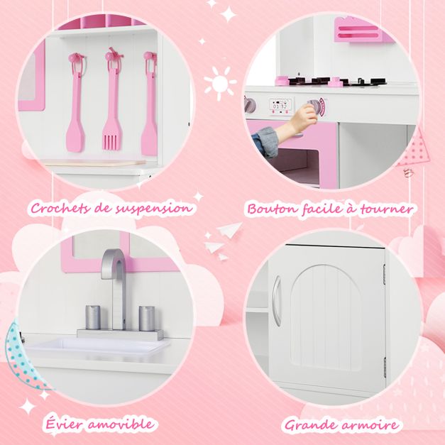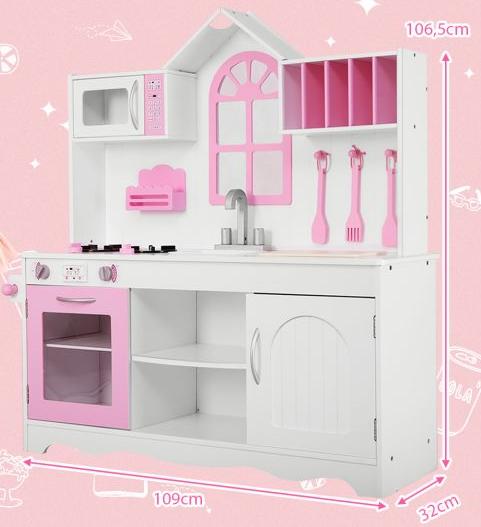Cuisine enfants dinette en bois avec evier, four micro-ondes cuisinières 3 spatules 109 x 32 x 106,5 cm rose 20_0006457