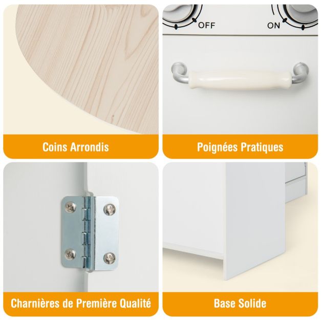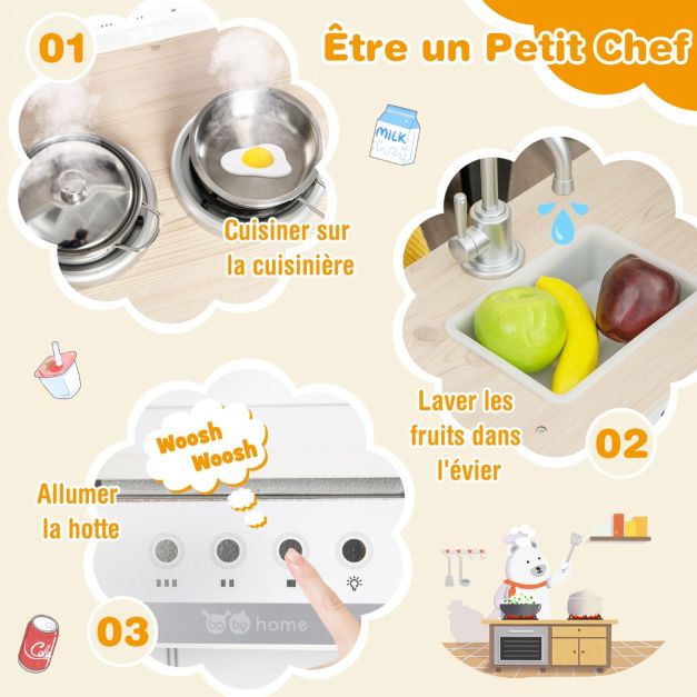 Comprend 1 cuisinière, 1 évier avec robinet, 1 réfrigérateur latéral, 1 distributeur d’eau réaliste et 1 hotte
