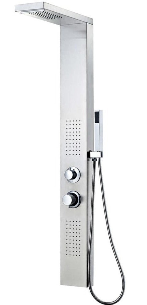 La tour de douche est faite d'acier inoxydable durable avec finition brossée et a un beau design carré.
