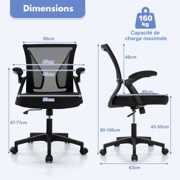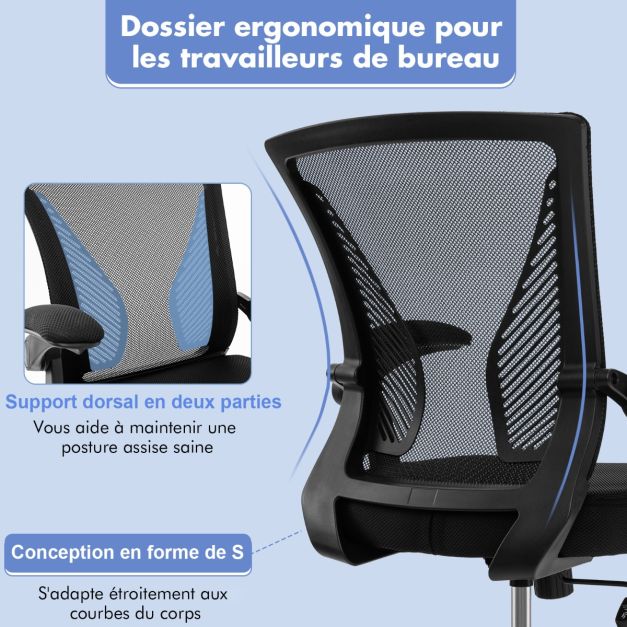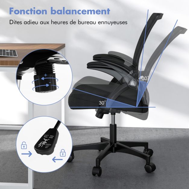 Chaise de bureau ergonomique chaise de travail pivotante réglable avec accoudoirs rabattables dossier à bascule à 30° noir 20_0008074