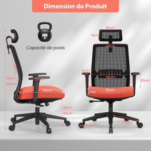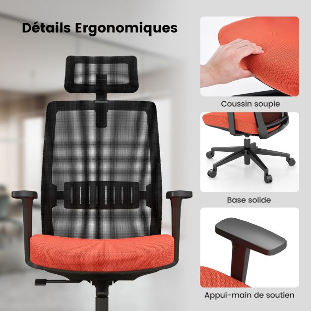 Chaise de bureau ergonomique réglable en hauteur dossier respirant soutien lombaire appui-tête 3D confortable pour bureau étude salle de conférence noir orange 20_0004840