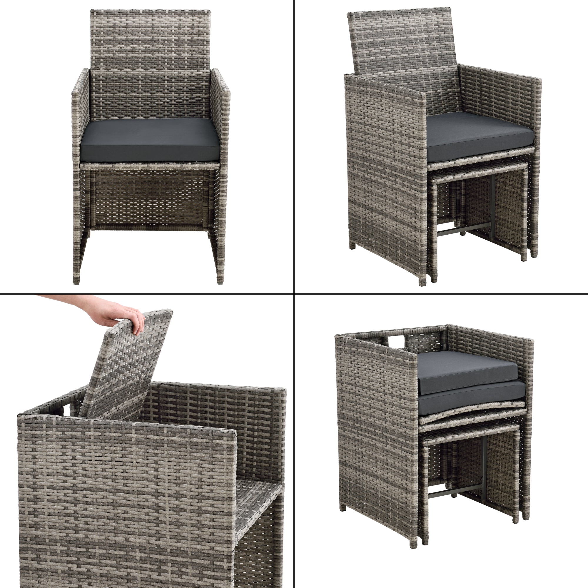 Les meubles en polyrotin créent une ambiance chaleureuse dans le jardin, sur la terrasse ou sous le porche. Vous pourrez vous détendre à la fin d'une longue journée dans le fauteuil en toute tranquillité ou bien inviter des amis pour l'apéro en été. Les fauteuils et les tabourets se rangent sous la table, ainsi vous pourrez même économiser de la place.