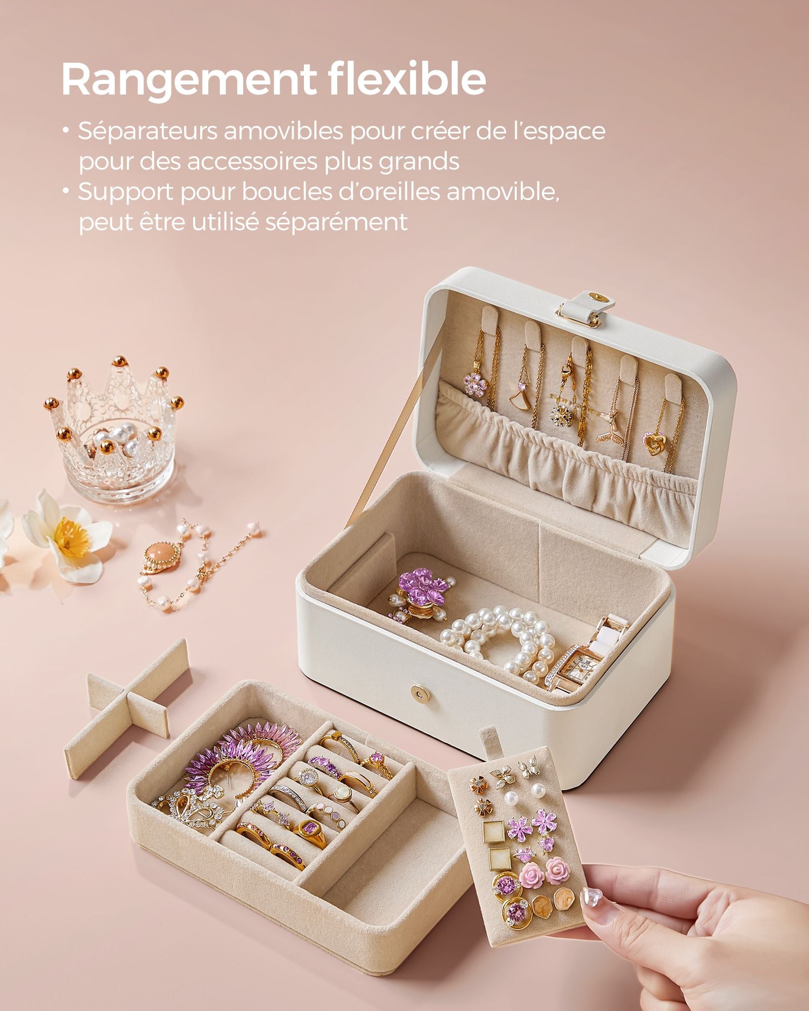 Au dos du couvercle : 5 crochets pour les colliers ; en haut : un petit plateau amovible pour les boucles d’oreilles et les bagues ; en bas : un grand compartiment pour les bracelets et d’autres accessoires plus grands.