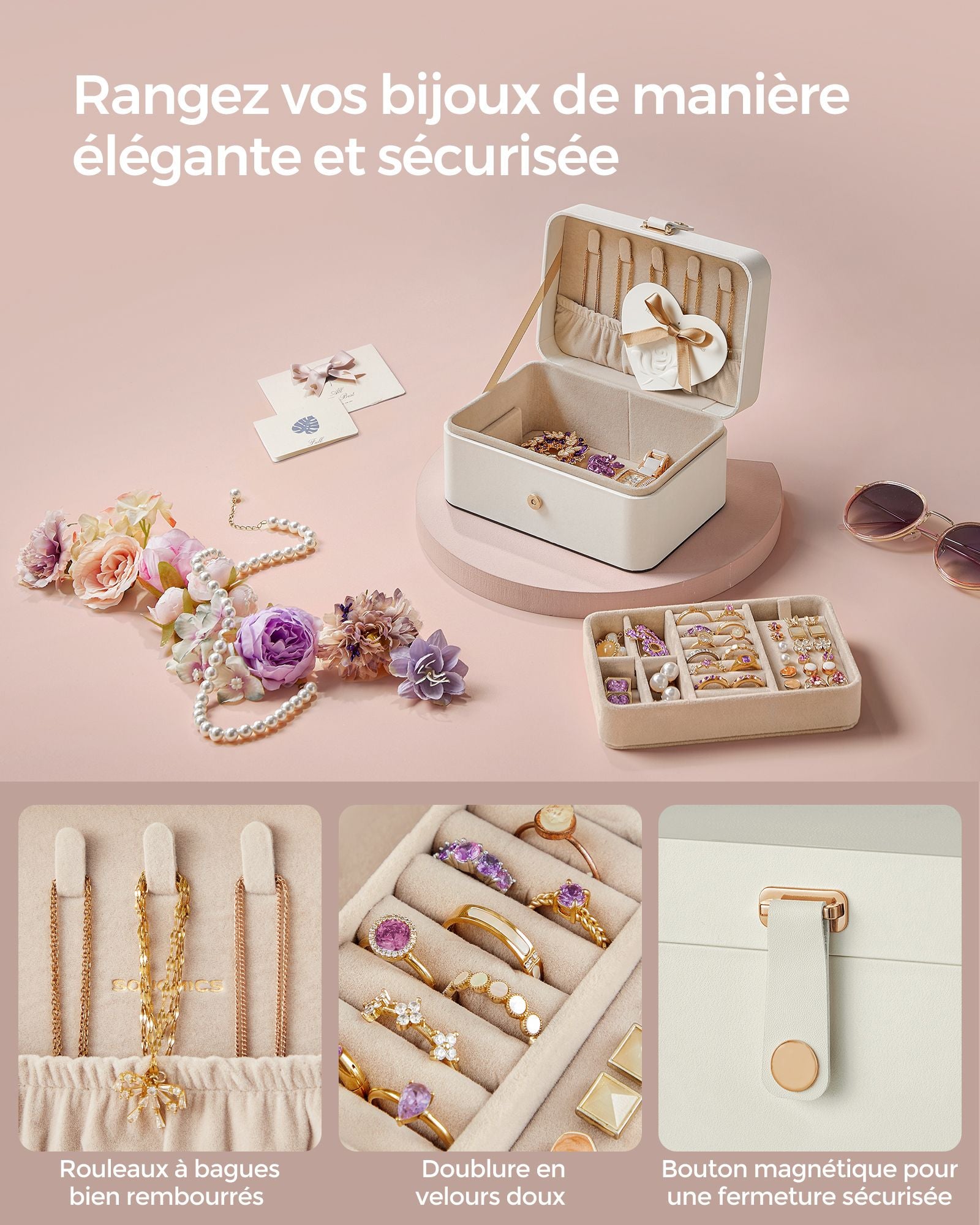 Les séparateurs en forme de croix en haut sont amovibles pour créer un espace pour des bijoux plus grands. Le support avec des trous pour les boucles d’oreilles est amovible. Grâce au bouton magnétique, cet écrin peut se fermer.