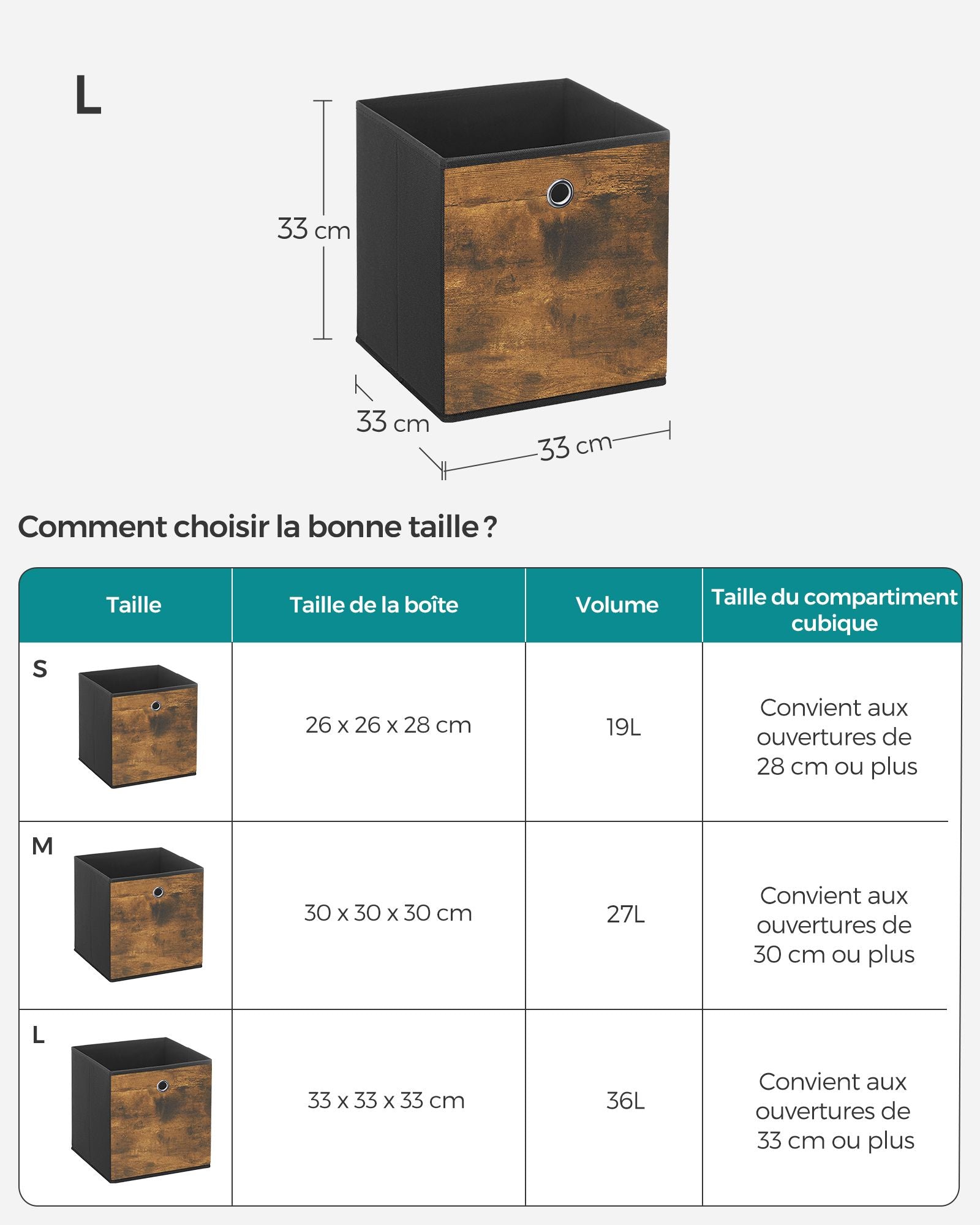 Avec leurs dimensions de 33 x 33 x 33 cm, ces boîtes en tissu s’adaptent aux étagères cubiques de 33 cm ou plus. Chaque boîte est équipée d’une poignée avec œillet pratique, ce qui permet de la tirer facilement et d’accéder rapidement à vos affaires.