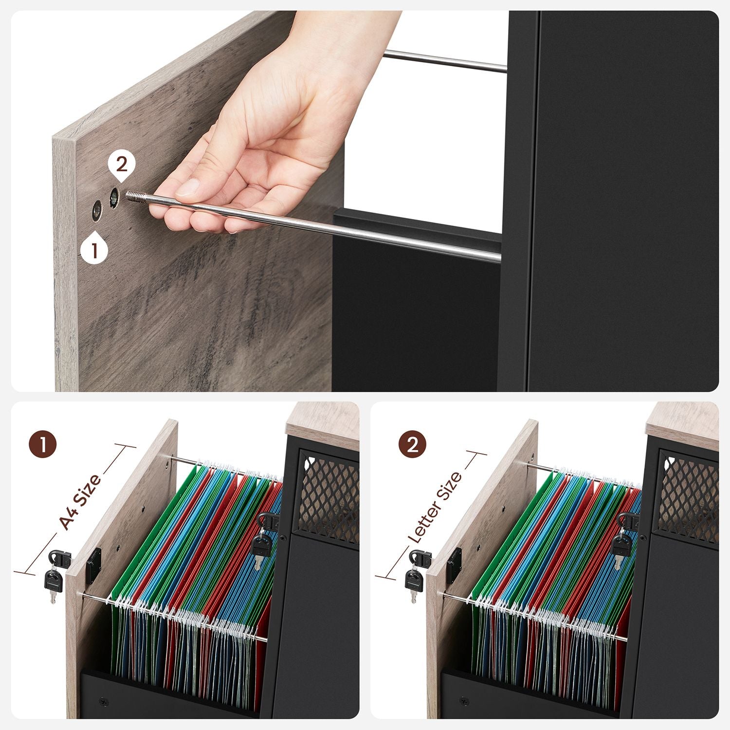 Ce caisson de bureau allie praticité et style industriel pour vous aider à garder un espace de travail bien organisé. Son compartiment ouvert est idéal pour ranger des papiers, son tiroir supérieur accueille vos stylos et fournitures, et le tiroir inférieur est conçu pour les dossiers suspendus A4. Le dessus peut aussi servir de support pour vos décorations ou accessoires de bureau.