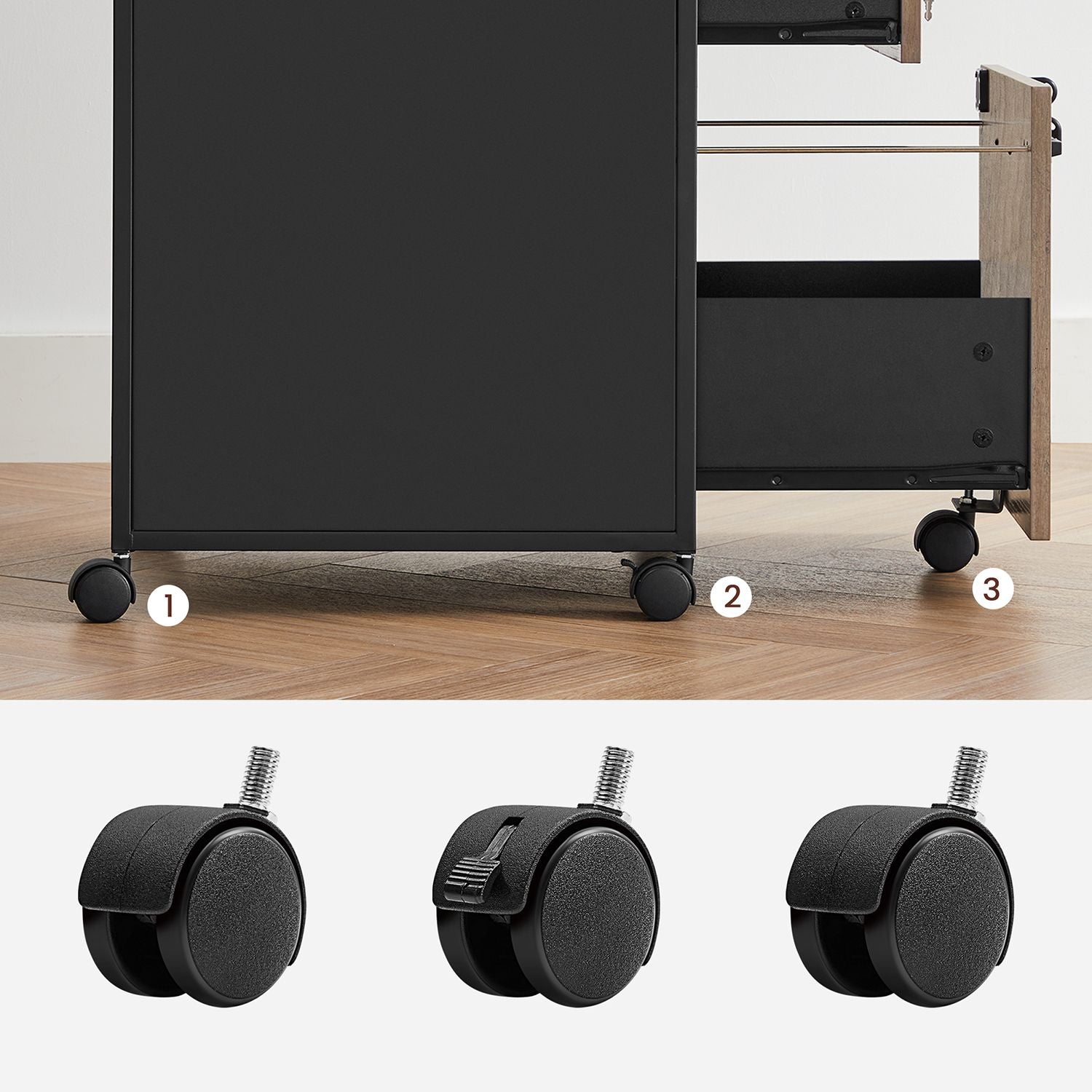 Pratique et sûr, ce caisson est équipé de 5 roulettes, dont 2 avec freins, pour une grande mobilité. Une roulette supplémentaire sous le tiroir du bas empêche le basculement. De plus, les tiroirs peuvent être verrouillés afin de protéger vos documents confidentiels.