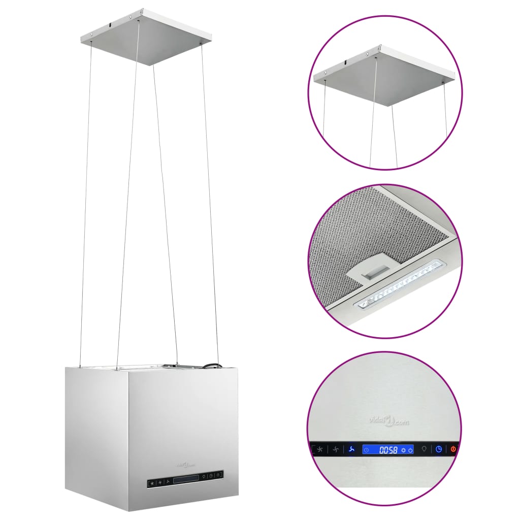 Cette hotte îlot est montée au plafond avec une plaque en acier inoxydable.