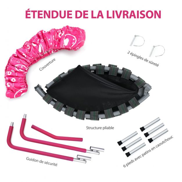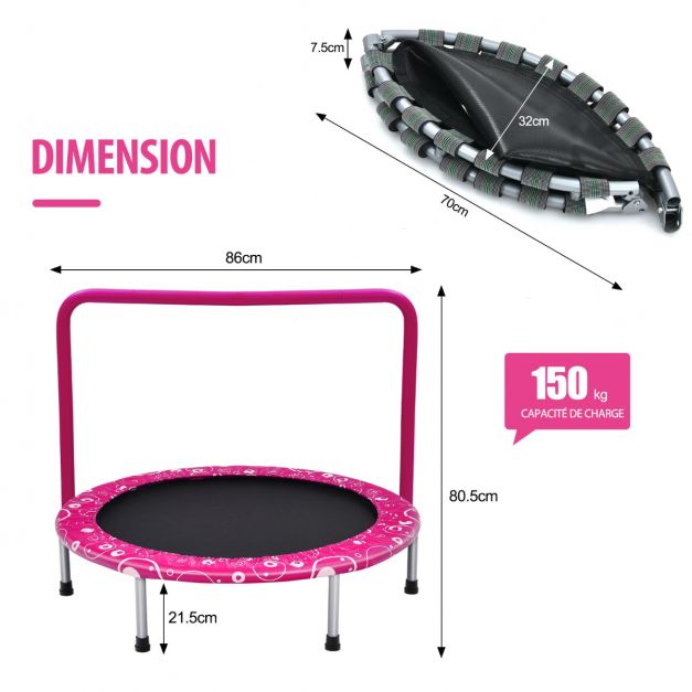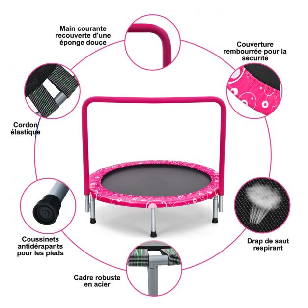 Trampoline enfants pliable diamètre 92 cm avec housse de sécurité matelassée et poignée recouverte intérieur 150 kg rose+noir 20_0006087