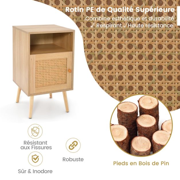 Table de chevet avec à porte cannage et pieds en bois massif table de nuit bohême fermeture silencieuse table d'appoint pour salon chambre 40 x 39 x 70 cm naturel 20_0009394
