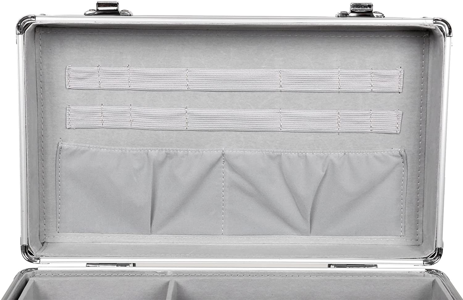 Matières: Cadre en alu; surface argentée en ABS; boîte en panneau de fibre à densité moyenne; poignée chromée en ABS;