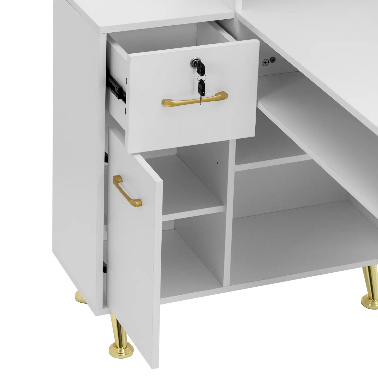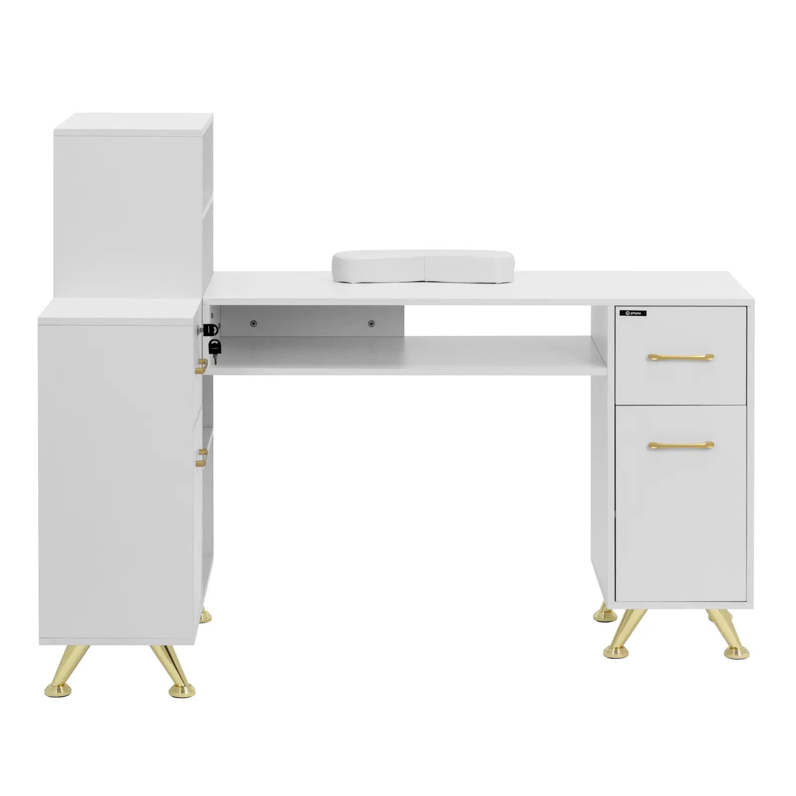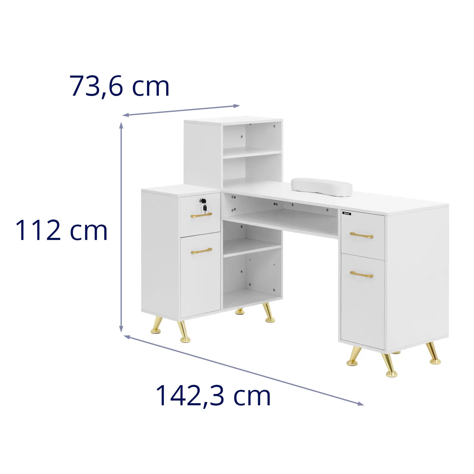 Table de manucure 142,3 x 73,6 x 112 cm verrouillable 2 tiroirs repose-mains MDF doré blanc 14_0009989