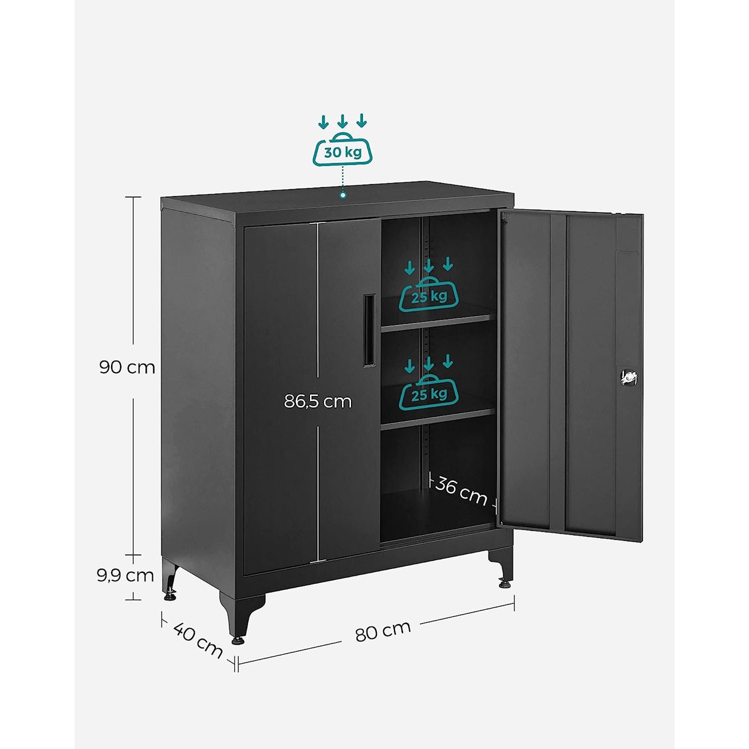 Ce grand placard de 40 x 80 x 90 cm offre de la place pour vos dossiers et tout ce que vous souhaitez. Les 2 étagères derrière les portes sont réglables en hauteur, parfait pour les objets de toutes les tailles.