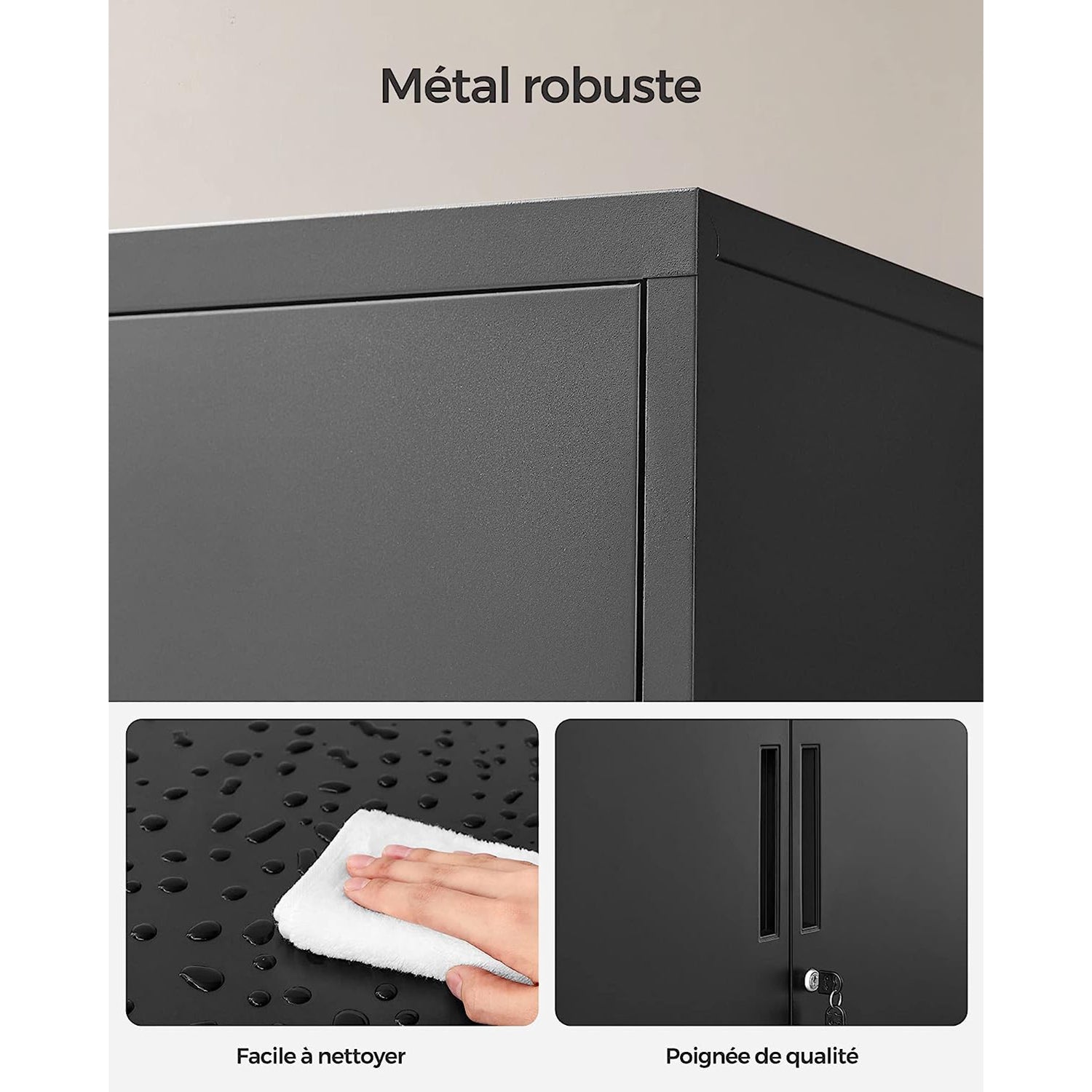 Ce meuble polyvalent est fabriqué en acier traité par poudrage, il est résistant à la rouille, robuste et durable. De plus, sa surface est résistante à l’eau et facile à nettoyer, pour que l’armoire paraisse toujours comme neuve.