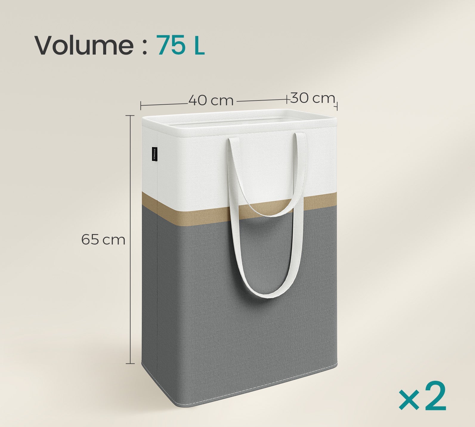 Chaque panier à linge offre une capacité généreuse de 75 litres, avec des dimensions de 40 x 30 x 65 cm. Ils sont parfaits pour accueillir le linge sale, mais peuvent également servir de solution de rangement pour les serviettes, les draps ou encore les vêtements hors saison.
