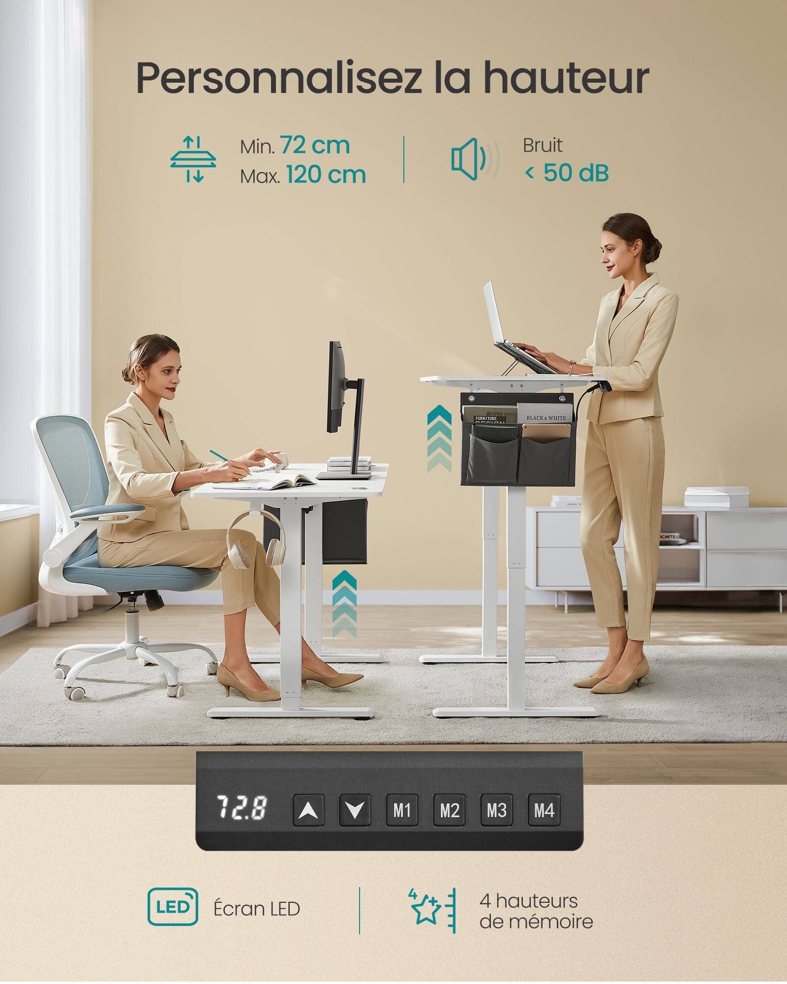 Équipé d’un moteur premium, il permet un réglage fluide de la hauteur tout en restant silencieux, avec un niveau sonore inférieur à 50 dB. Vous pouvez ajuster la hauteur entre 72 et 120 cm et mémoriser jusqu’à 4 positions préférées. Pour plus de sécurité, le système s’arrête et revient légèrement en arrière en cas d’obstacle détecté.