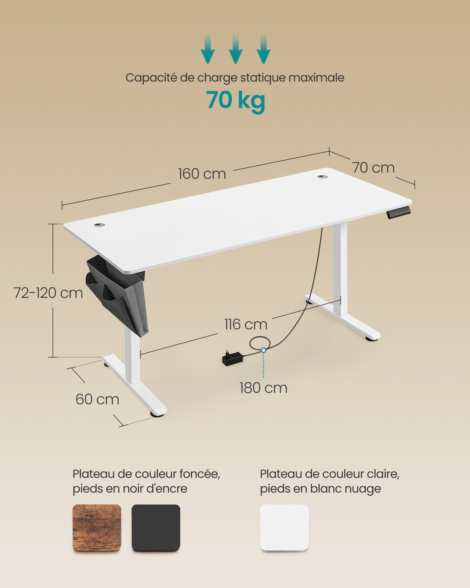 Dimensions : 70 x 160 x (72-120) cm (P x L x H)