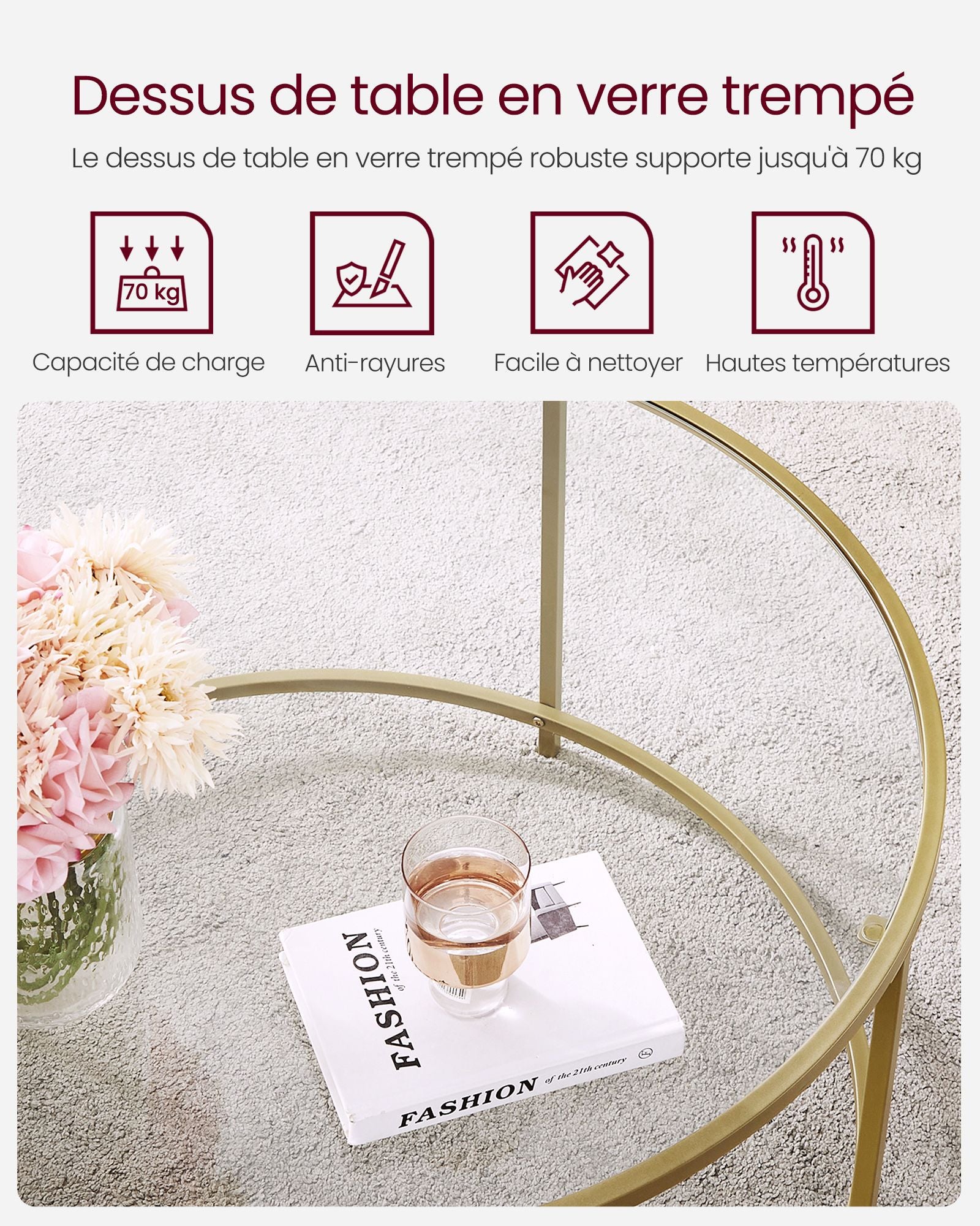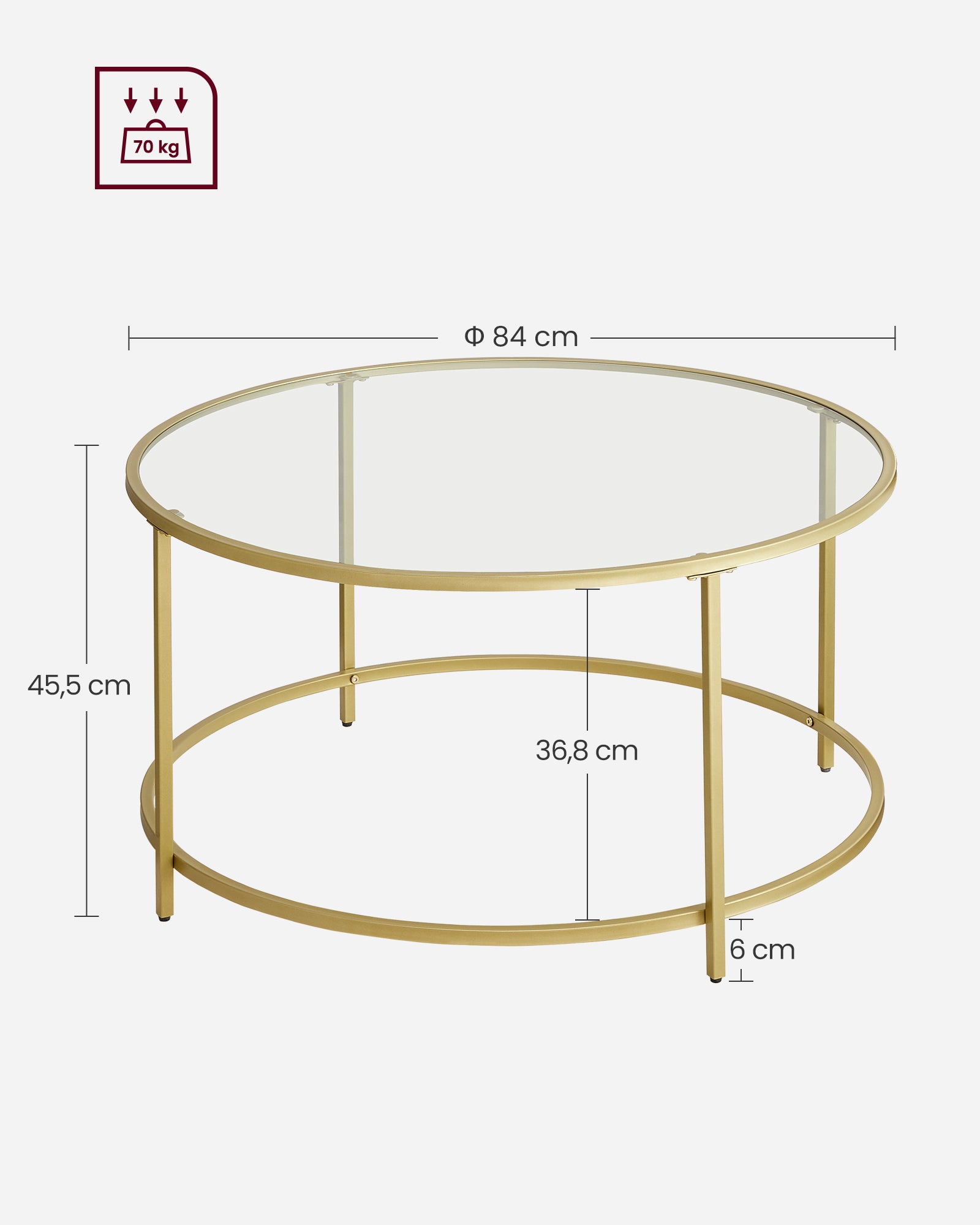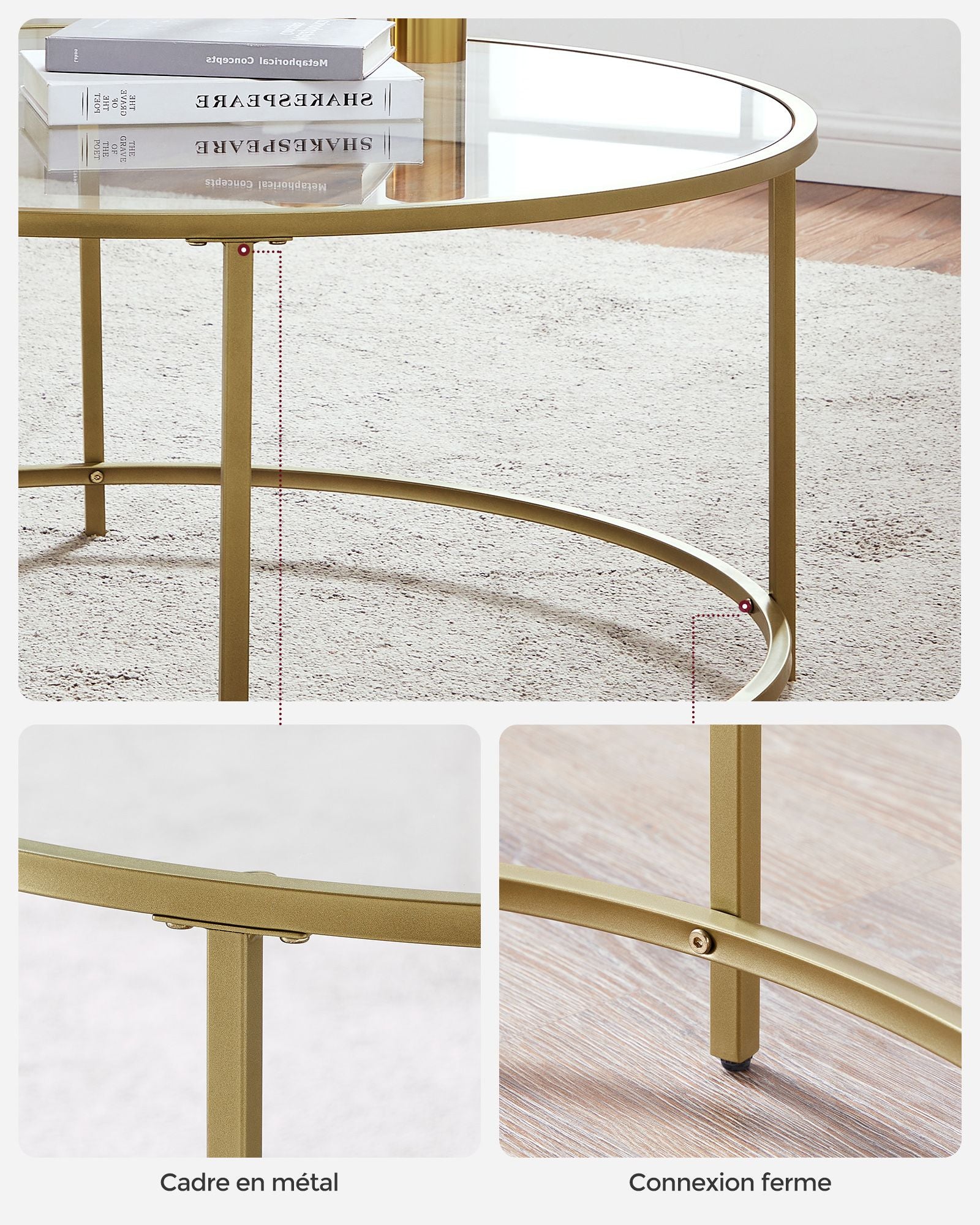 Table basse ronde plateau en verre trempé 84 x 84 x 45,5 cm armature métallique dorée table de salon bout de canapé robuste et stable décoratif doré 12_0007458