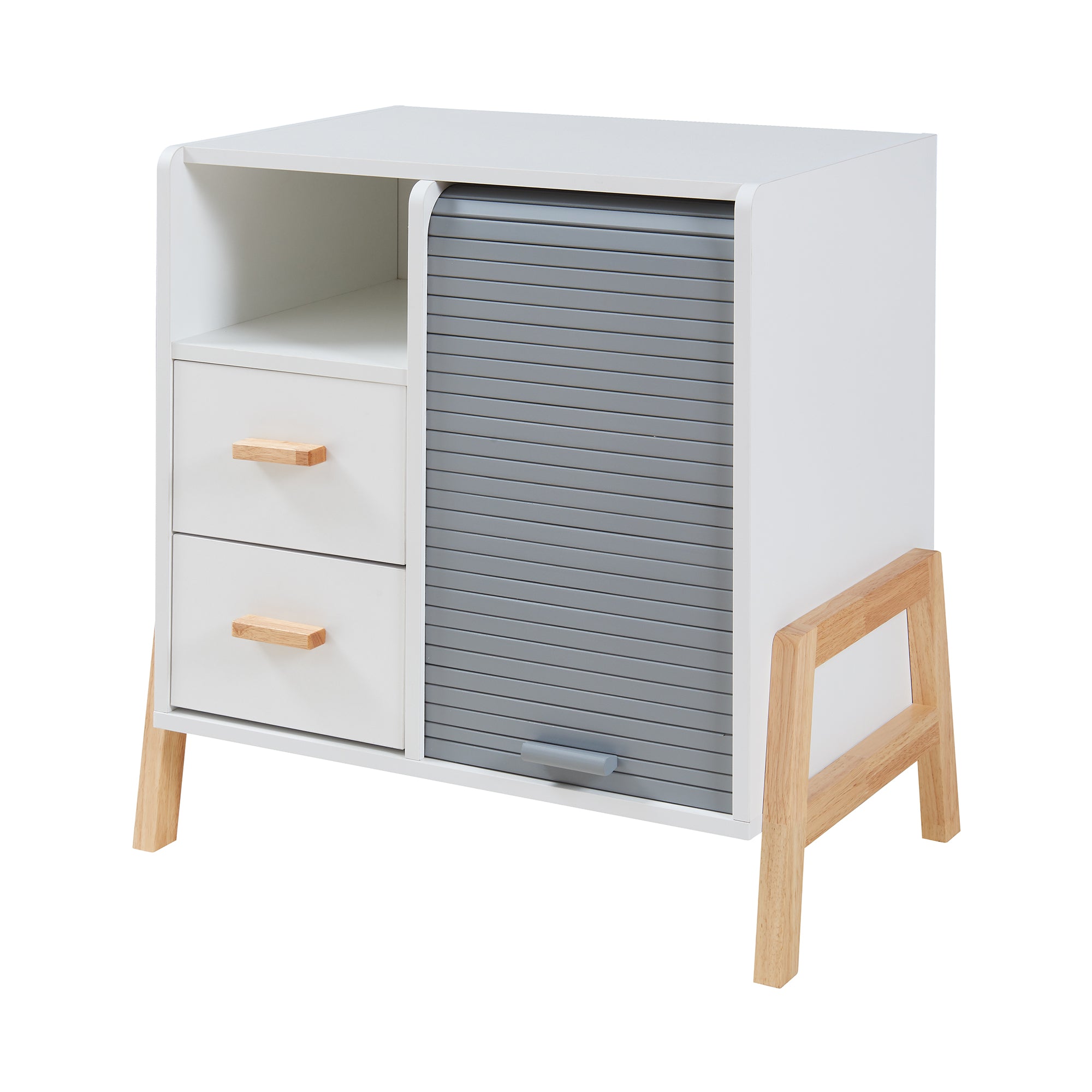 Notre élégante armoire complète parfaitement votre espace de vie et offre une solution pratique pour ranger tous les objets. Il dispose d'une porte avec rideau déroulant, d'un compartiment de rangement ouvert et de 2 tiroirs.