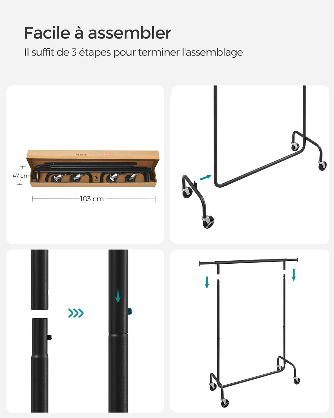 Grâce à ses 4 roulettes pivotantes à 360°, dont 2 équipées de freins, ce portant est facile à déplacer d’une pièce à l’autre tout en restant stable lorsque vous le verrouillez.