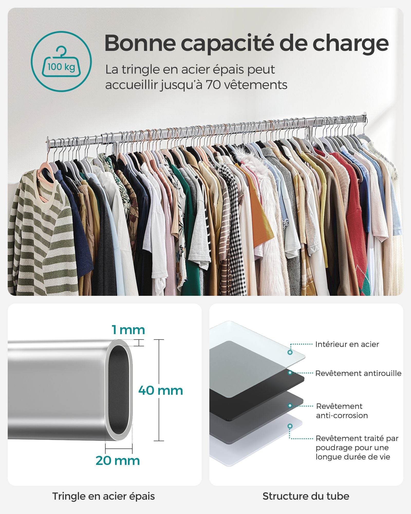 Armature entièrement métallique, robuste - L'ensemble du portemanteau est composé de tubes en métal chromé de haute qualité; le tube plat supérieur peut supporter une charge maximale de 90 kg (repartis uniformément), il est stable et n'oscille pas.