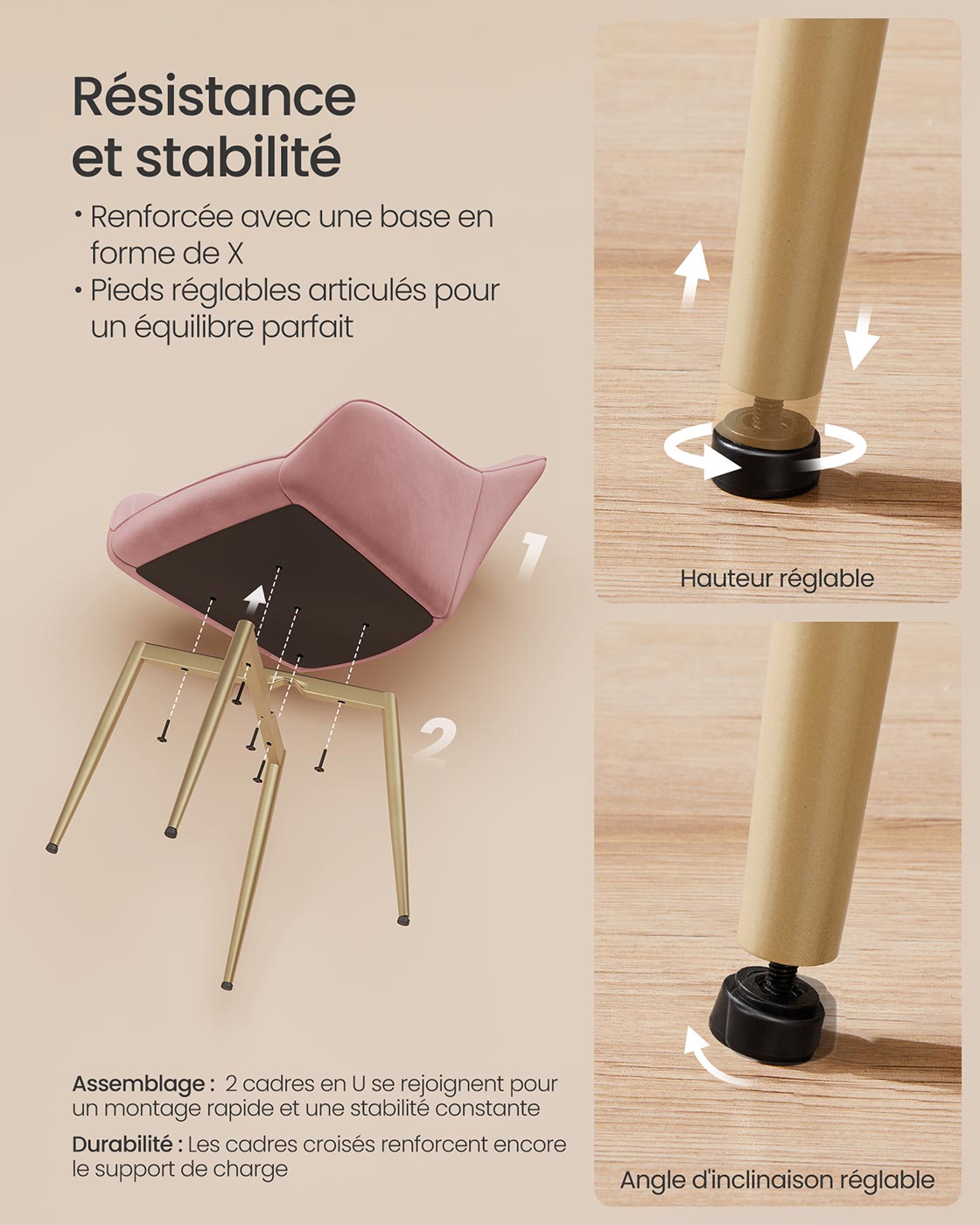 Solide et stable, cette chaise repose sur des pieds métalliques renforcés et réglables qui assurent une excellente stabilité, même sur des sols légèrement irréguliers. Elle peut supporter jusqu’à 120 kg.