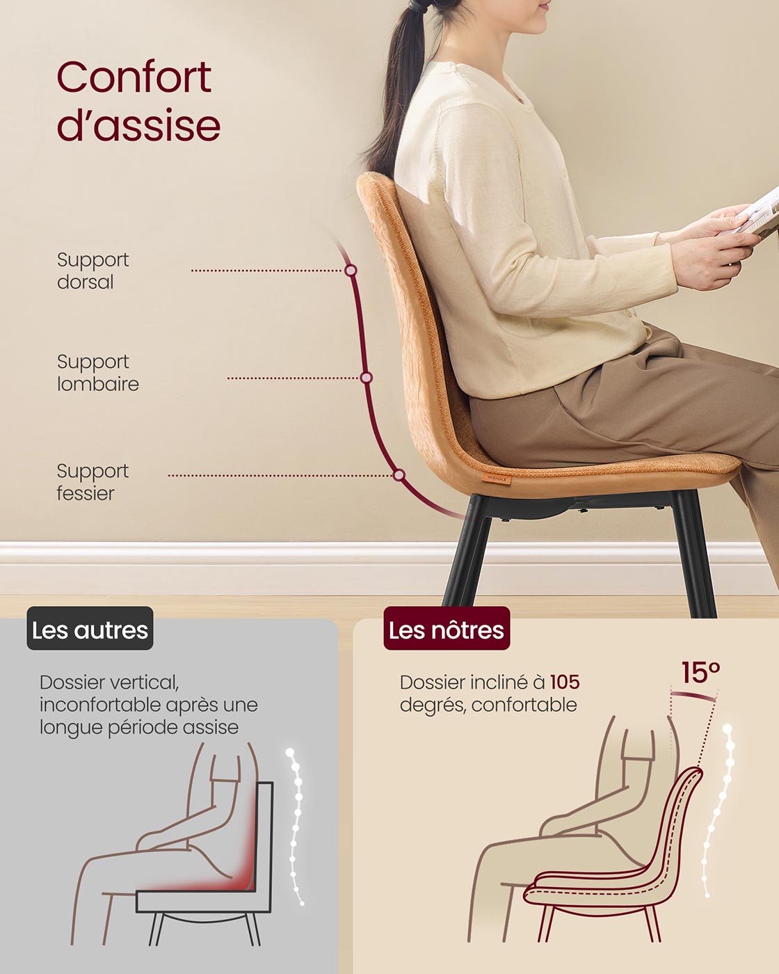 Le dossier, incliné à 105°, offre une assise ergonomique et confortable, parfaite pour profiter pleinement de vos repas ou rester assis longtemps sans inconfort.