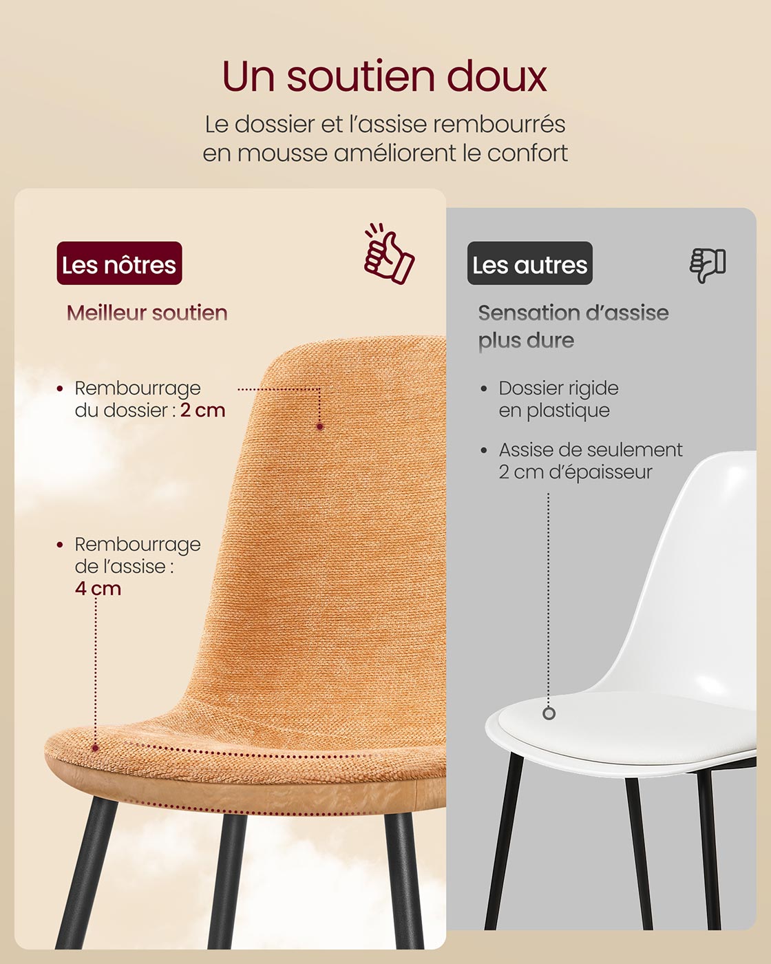 Le devant de ces chaises est habillé d’un tissu chenille doux, tandis que l’arrière est recouvert d’un PU texturé glacé de qualité. Ce contraste de matières leur confère une allure élégante et originale, idéale pour apporter une touche raffinée à votre salle à manger.