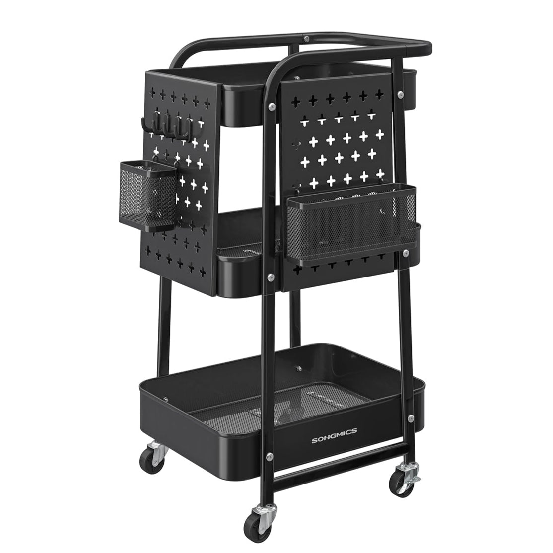 Chariot de rangement 3 plateaux en maille métallique 2 panneaux perforés amovibles 2 supports suspendus 4 crochets pour bureau cuisine salon salle de bain noir 12_0005011