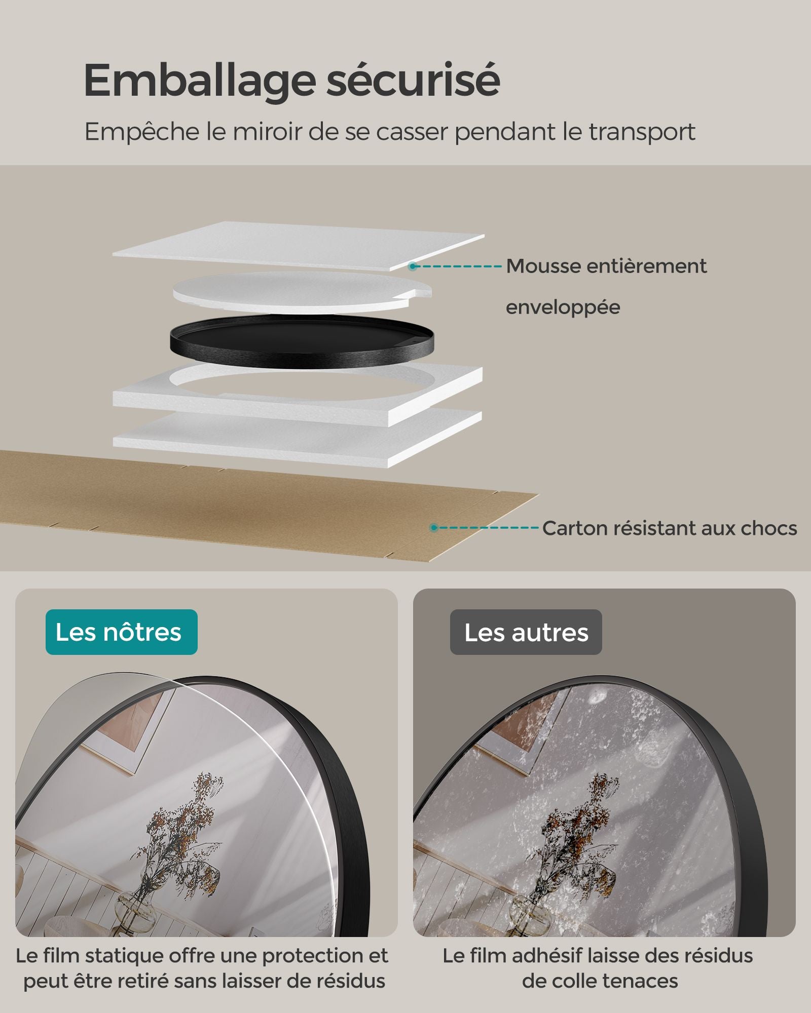 Facile à installer, il vous suffit de choisir un mur solide, percer un trou, installer la vis d’expansion et accrocher le miroir. En quelques étapes seulement, vous profitez d’un accessoire décoratif qui agrandit visuellement l’espace et apporte de la luminosité.